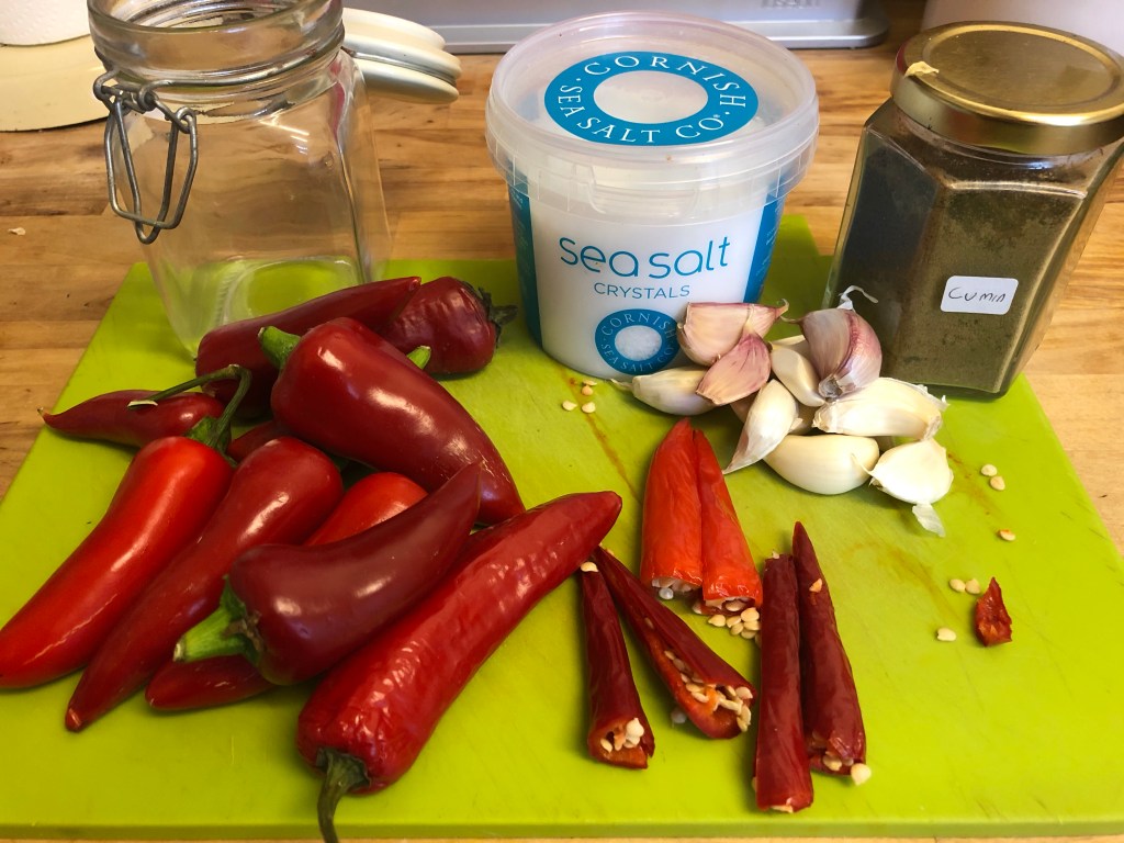 Having been left with a number of red chillies rather than see them go to waste I made a chilli chutney ready for those anticipated summer evenings sat in the garden with cheese and wine.