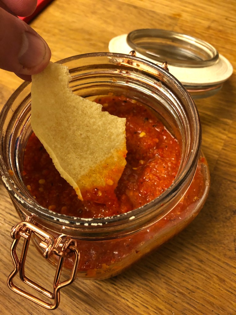 Strain the chillies leaving the leftover flavoured water. Add the rest of the ingredients and chillies to a blender and blitz until it’s nice a smooth.