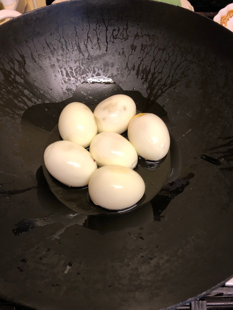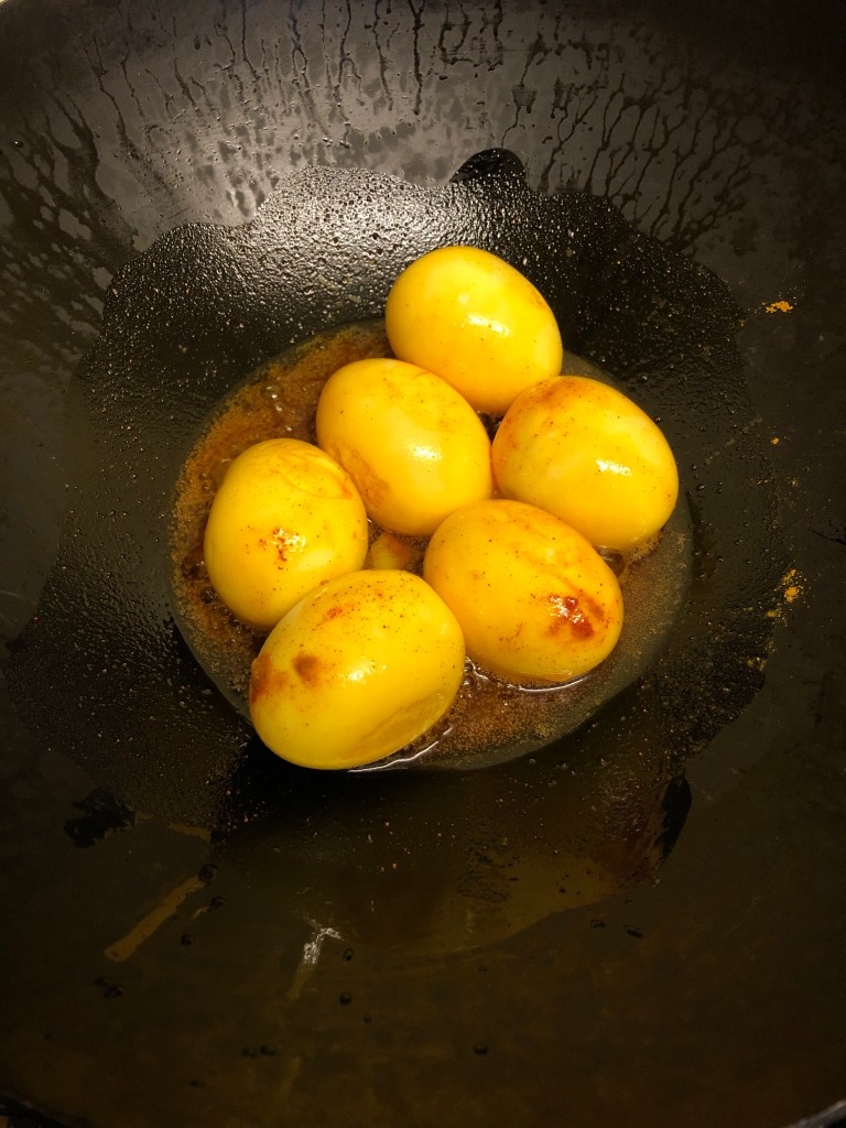 Heat the veg oil in a heavy based saucepan, add the boiled eggs & fry for 1-2 minutes.