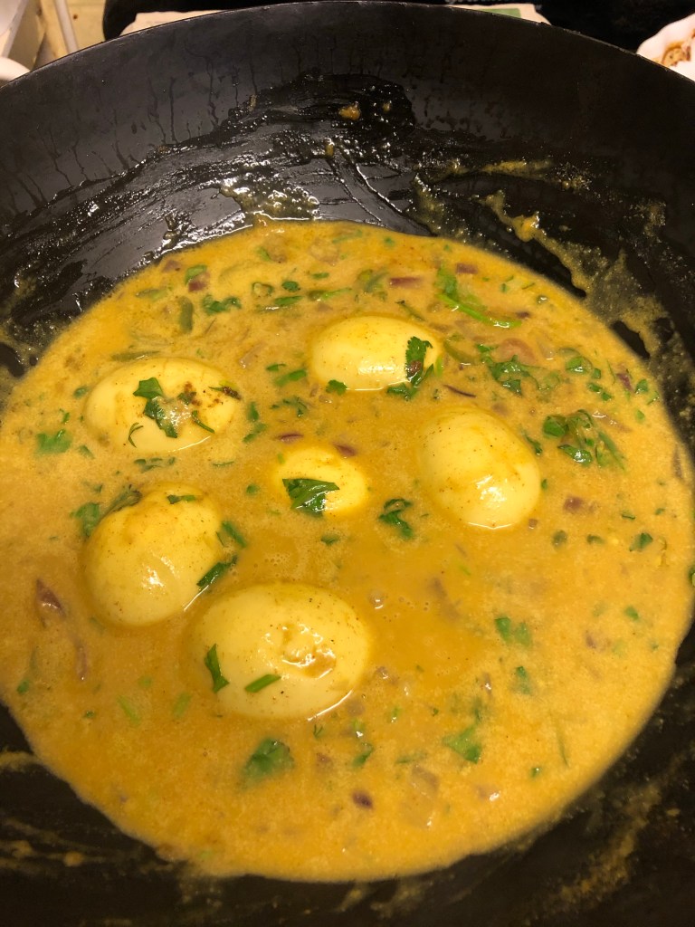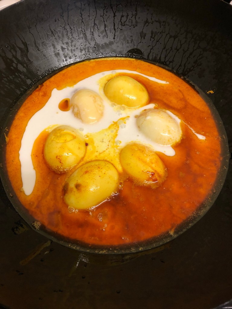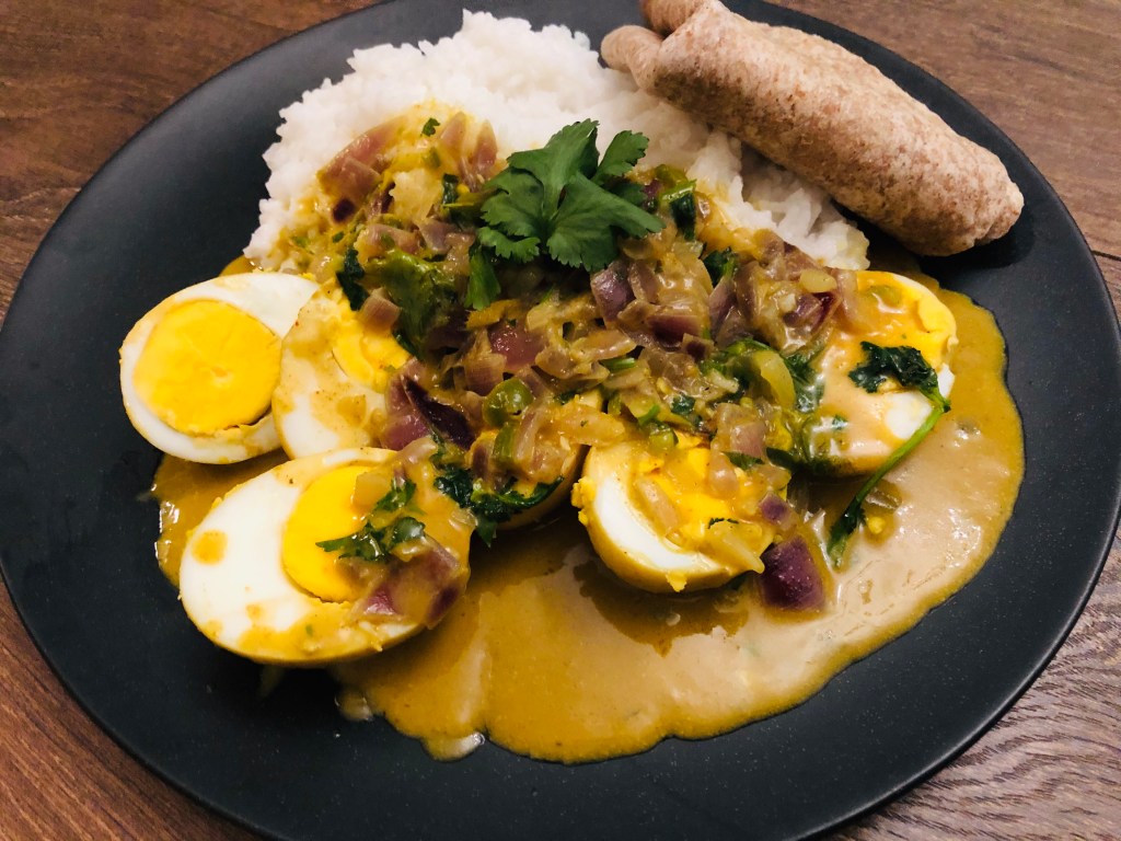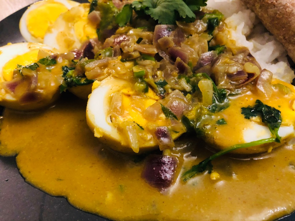 Ingredients- 3 tbsp vegetable oil, 6 hard boiled eggs, 1 tsp turmeric, 1 tsp Kashmiri chilli powder, 400ml coconut milk, 2 red onions diced, 4cm finely shredded ginger, 3 green chillies thinly sliced, 1/2 tsp salt, 1 tsp sugar, handful of chopped coriander & 1/2 tsp garam masala.