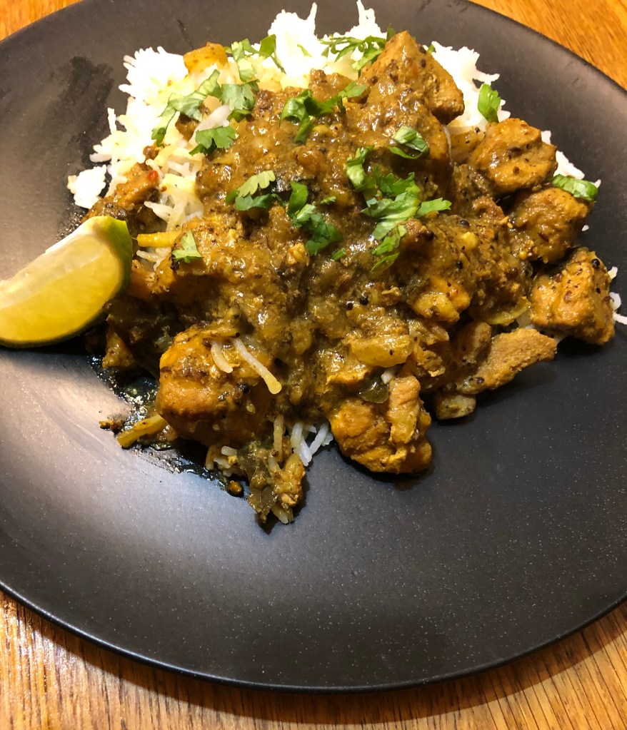 Ingredients- 1 kg pork, 2 tbsp coriander seeds, 1 tbsp cumin seeds, 1 tbsp black mustard seeds, 1 tbsp turmeric, 1 tbsp fennel seeds, 5 cardamom pods, 5 cloves, 2 onions diced, 4 garlic cloves sliced, 1 small cinnamon stick, 15 curry leaves, 25mm ginger sliced into matchsticks, 100ml tamarind paste, 200ml coconut milk & 300ml veg stock.