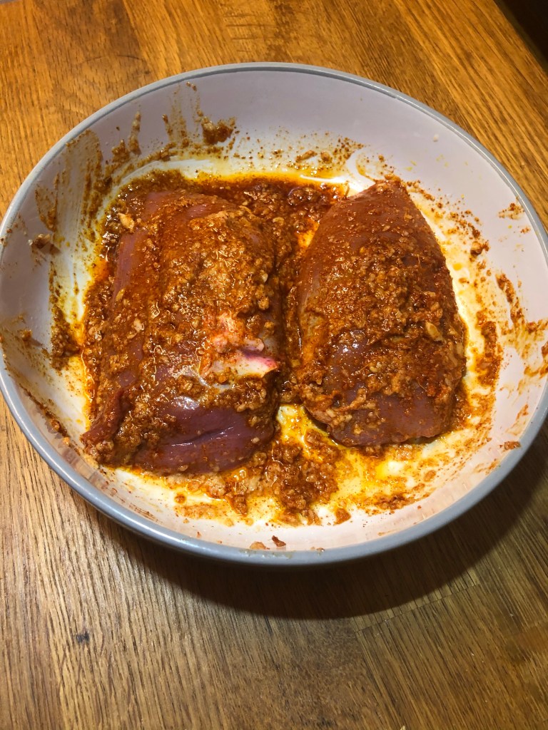 Duck breasts, 1 tbsp of vegetable oil, 1 tbsp of garam masala, 2 tbsp of garlic & ginger paste, pinch of chilli. Mix all together and leave to one side whilst you open a nice cold Cobra and relax.