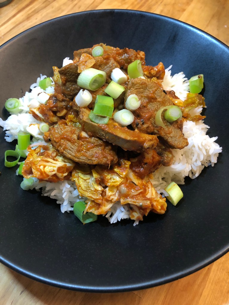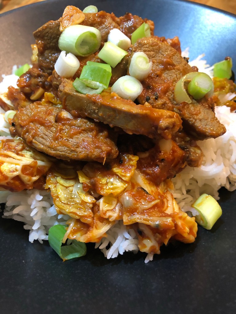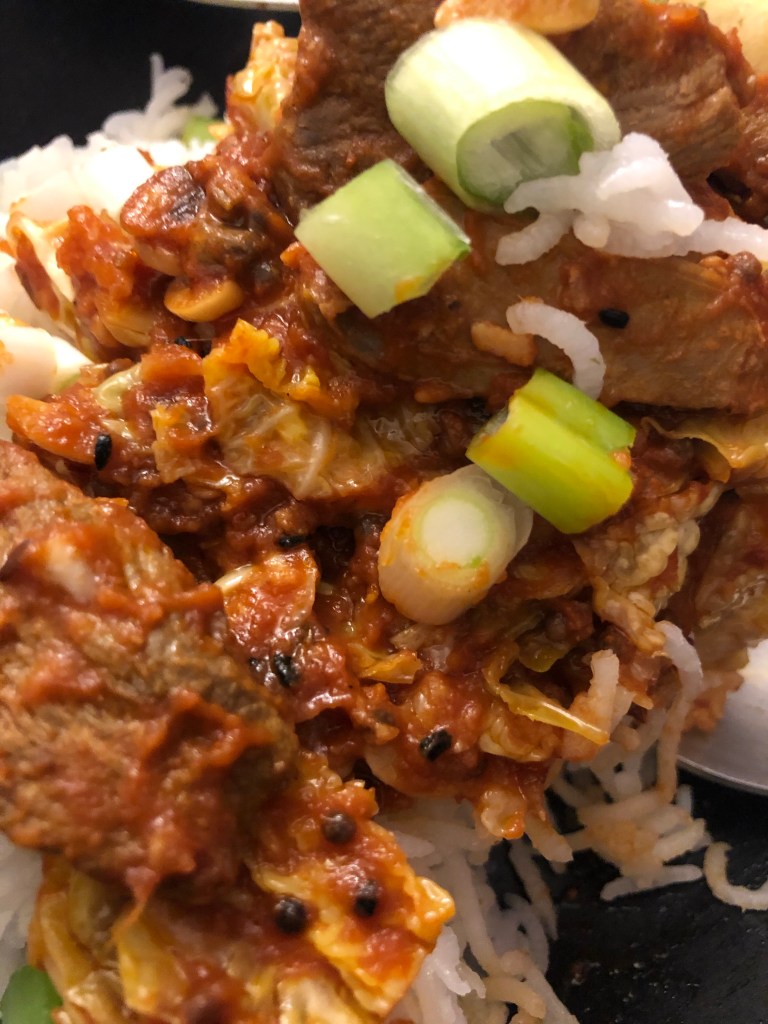 Heat 3 tbsp of oil in a pan, add 1 tbsp of panch phoran (homemade spice mix in my tempering spice post) and fry for 30 seconds or so. Add 2 tbsp of garlic slivers plus a little salt and gently fry. Add 2 tbsp of garlic and ginger paste plus 1 heaped tsp of chilli flakes and 250ml of passata followed by 1/2 Savoy cabbage shredded. Cook until cabbage is tender or how you like it. Add back the duck marinade from early along with the duck to heat it through then your ready for this amazing dish ā¤ļø. Top with diced spring onions.
