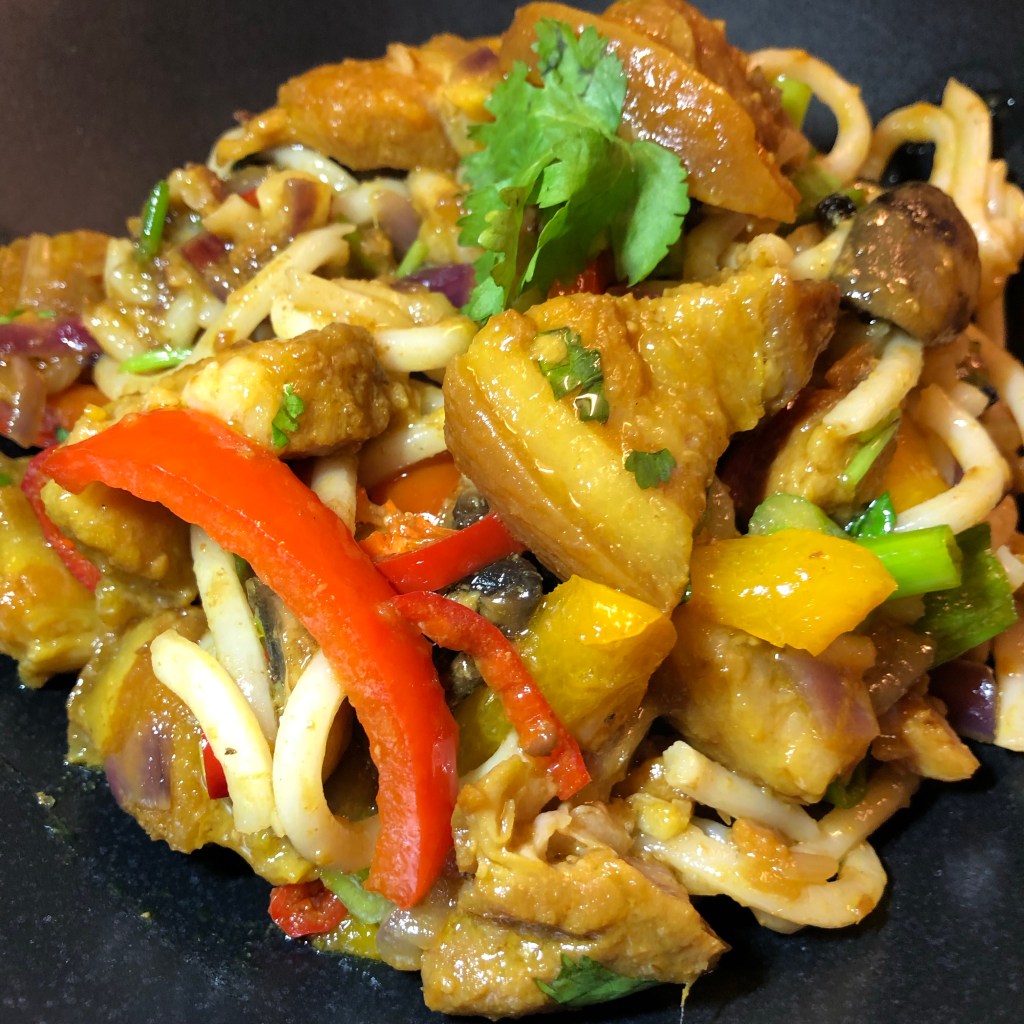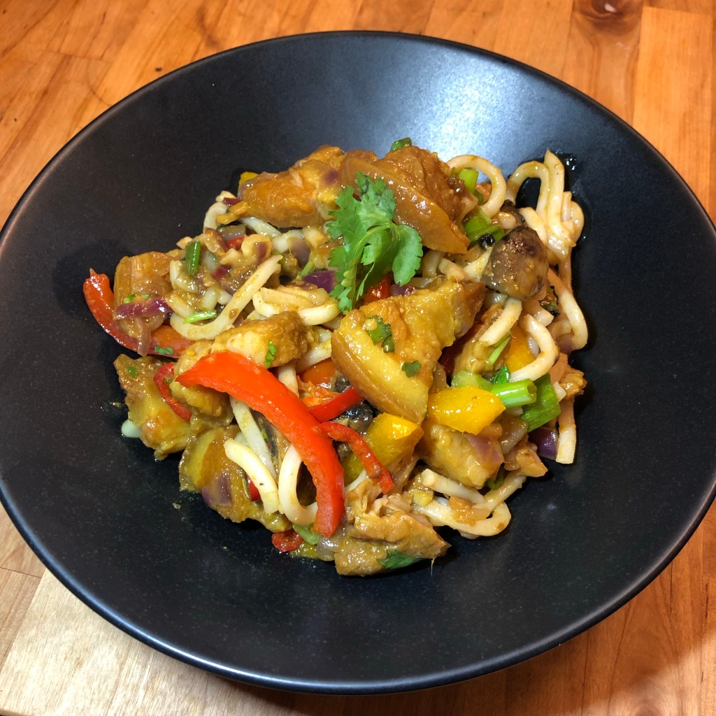 I added the precooked belly pork mix then the udon noodles to take on the flavours then finished with diced red chillies.