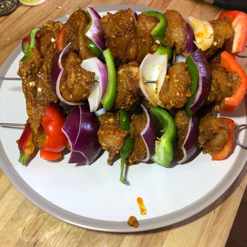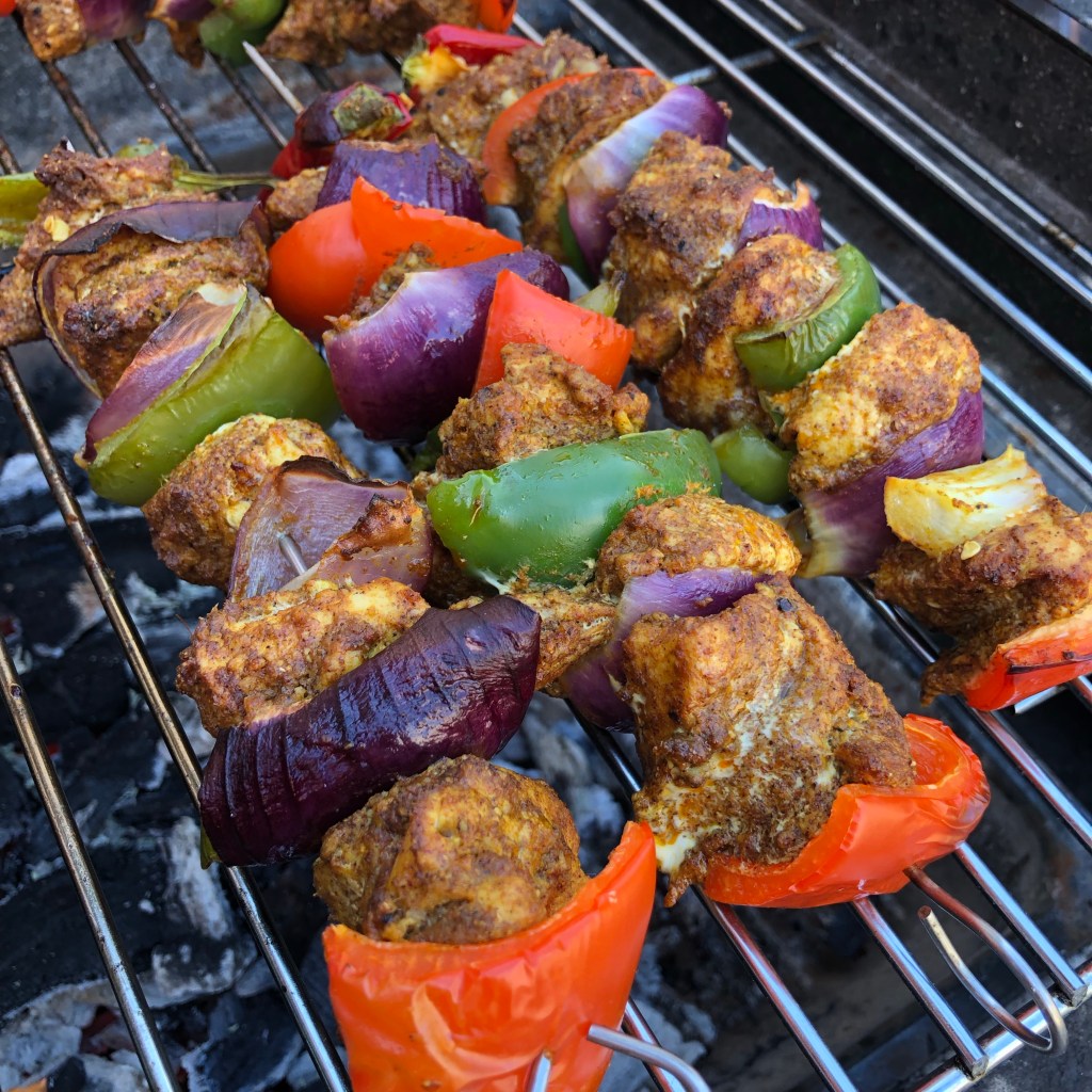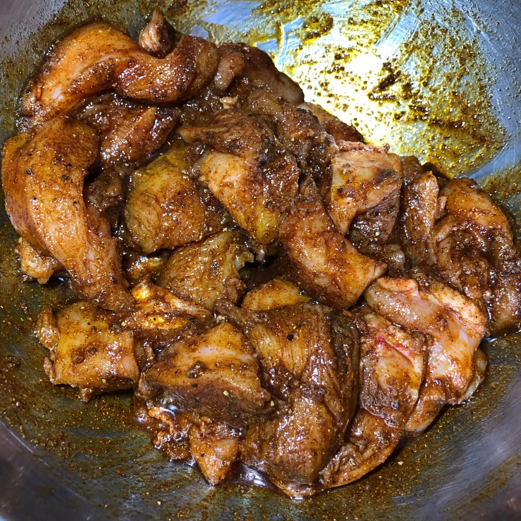 Ingredients- chicken thighs cubed, 2 tbsp of garlic & ginger paste, 5 tbsp of rapeseed oil, 1 tbsp of ground cumin, 1 tbsp of ground coriander, 1 tsp of allspice, 1/2 tsp of cinnamon, 1/2 tsp of turmeric, 1 tbsp of paprika & a good pinch of salt & pepper. This can be marinated for 2-24 hours. The longer the better.