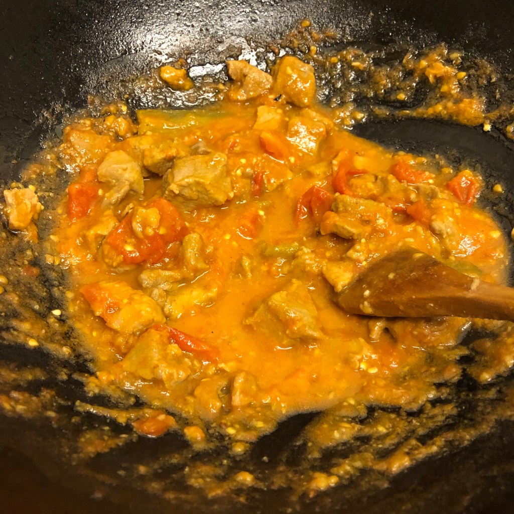 Add another 250ml and place your pre-cut tomatoes and chillis on the top of the meat. Bring to a simmer and allow this to reduce again.