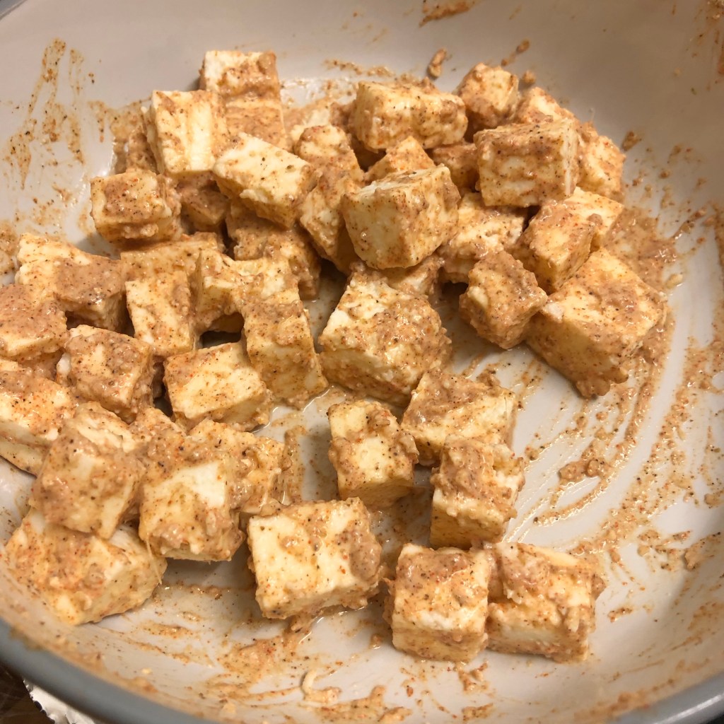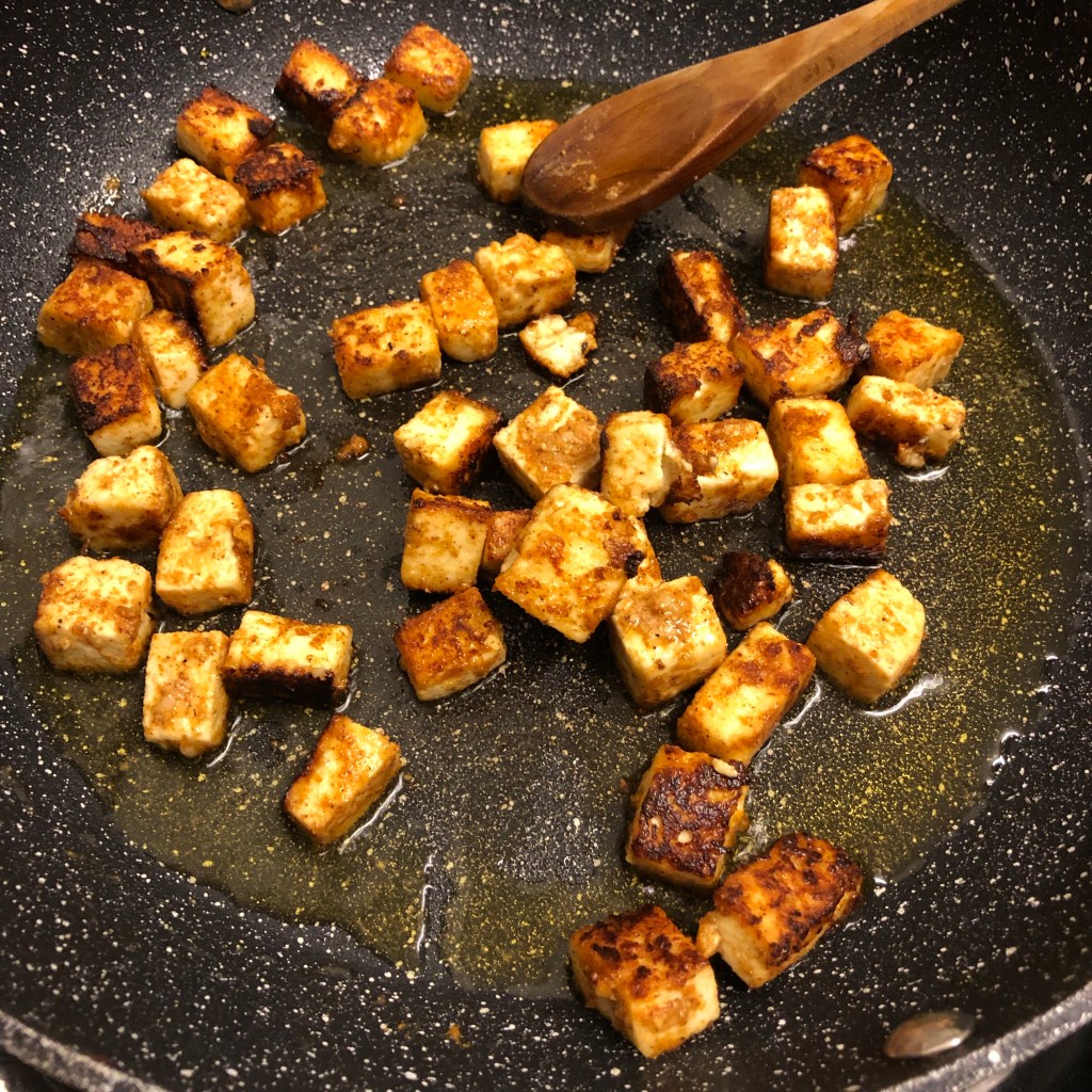 Heat a little rapeseed oil and gently fry your paneer to colour and crisp the outside. Once they have a slight crust remove from the heat allowing them to cool, it’s very difficult not to nibble them at this stage 😯.