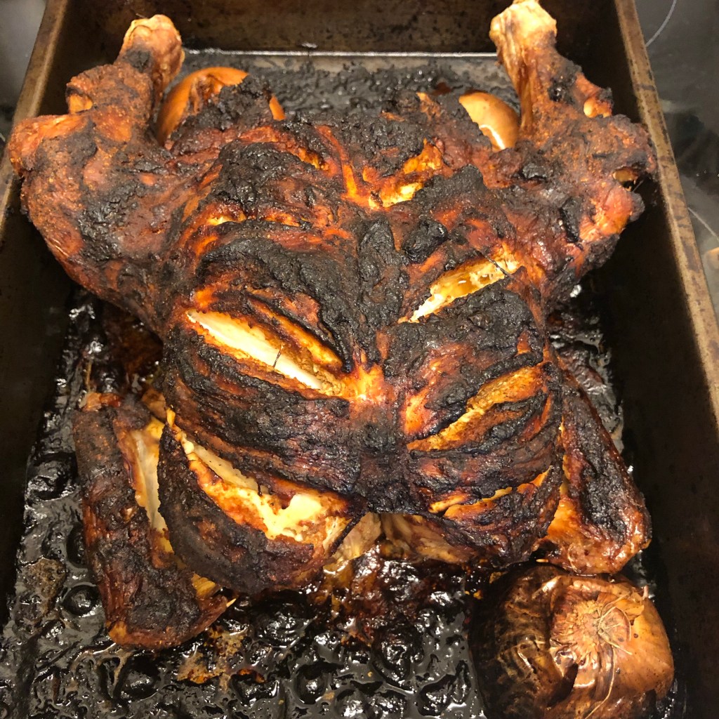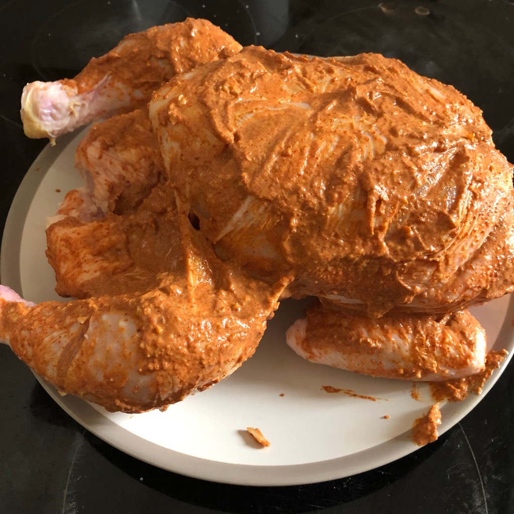 Marinade – 4tbsp of Greek yogurt, 2 tbsp of garlic and ginger paste, 2 tsp of paprika, 1 heaped tbsp of tandoori masala. Mix well. With a sharp knife score the flesh of the chicken. Coat the chicken making sure the scores you’ve made are full of this marinade. Allow to sit in the fridge for 3-48 hours.