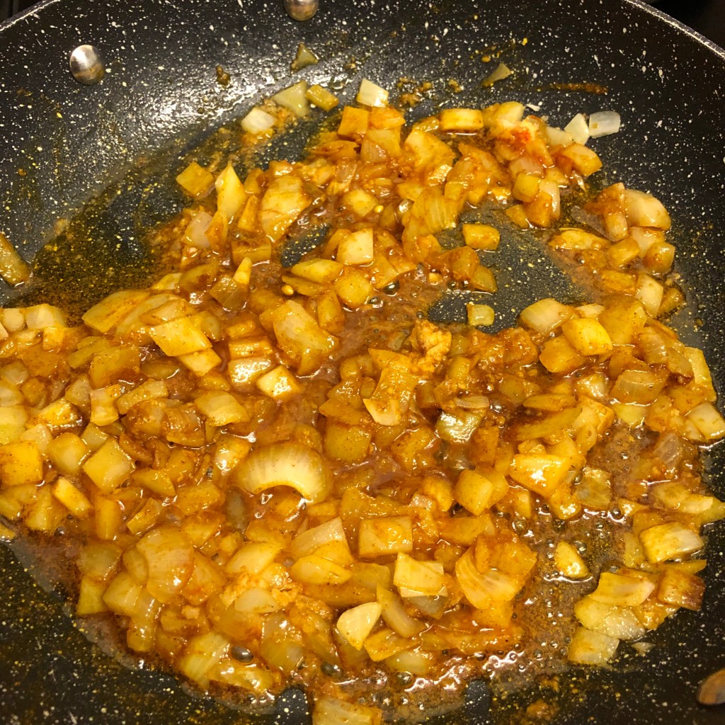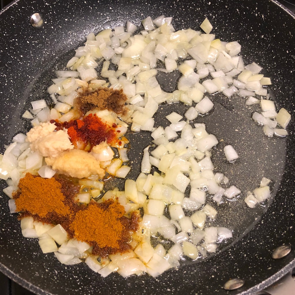 Start be heating the rapeseed oil then adding your onion to fry for 3/4 minutes. Once your onions looked cooked added your spices along with the garlic and ginger paste. Then mix well coating the onions.