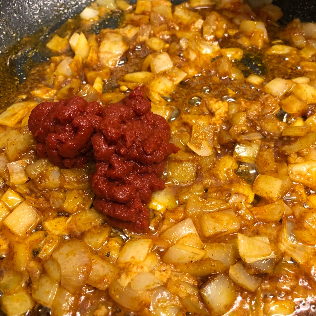 This should make the kitchen smell amazing. Add the tomato purée and mix well.