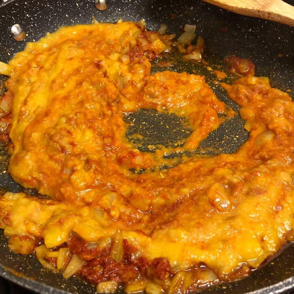 Then add half of your pre-made base sauce and again mix well. Then leave alone for a few minutes without stirring. The edge of the pan will start to caramelise and this is a flavour sensation waiting to happen.