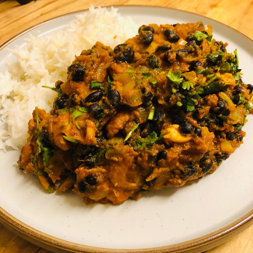 1 tbsp of rapeseed oil, 1/2 onion diced, 1 1/2 tsp of garlic and ginger paste, 1/2 tsp of cumin, 1/2 tsp chilli powder, 2 tsp of curry powder, 3 tbsp of tomato purée, 1 cup of pre-made base sauce, 100-200g of diced chicken ( I prefer thighs), 1 tin of black beans drained and washed, salt and coriander to garnish.