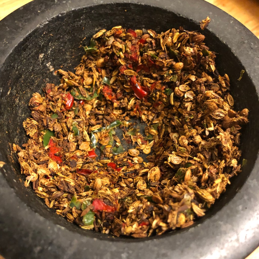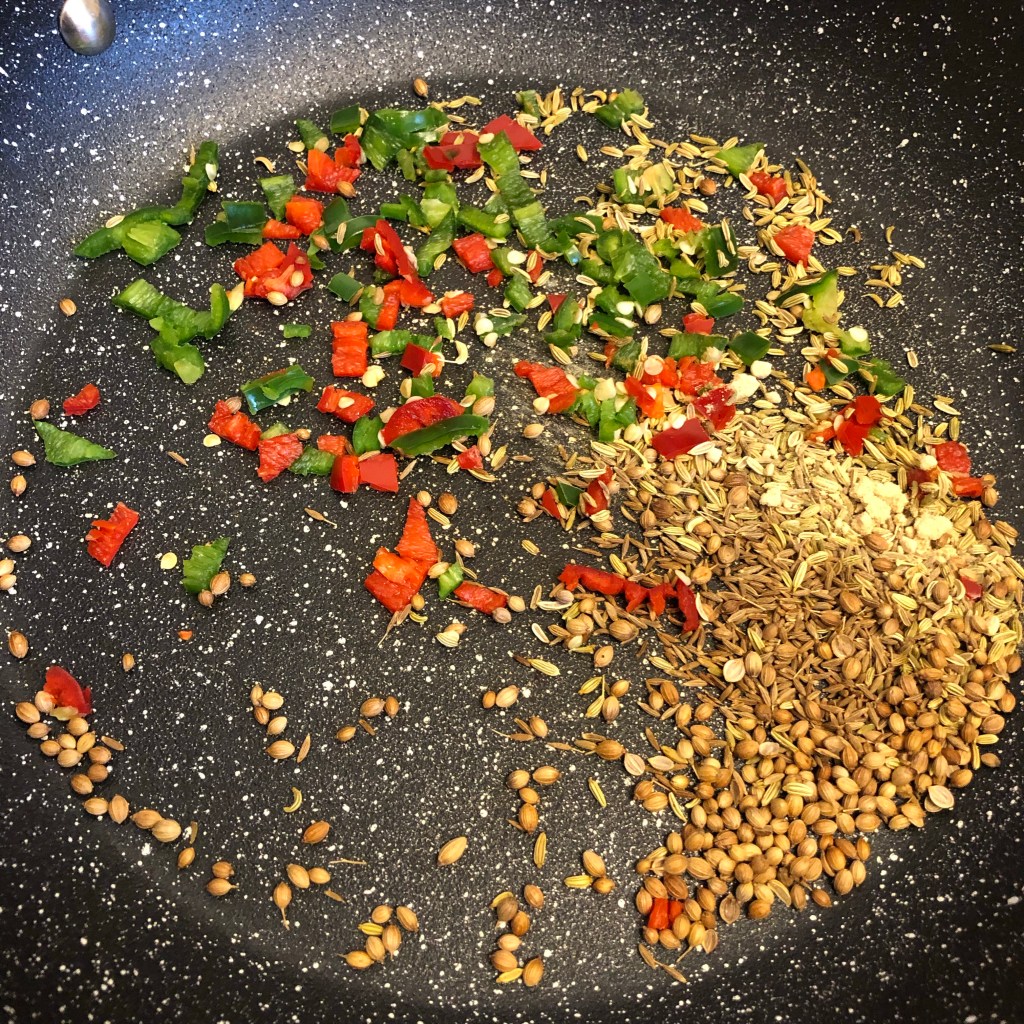 Take a dry pan and fry the green chillies with the whole spices. As the kitchen starts to smell fragrant and spices begin to toast remove them from the heat.
