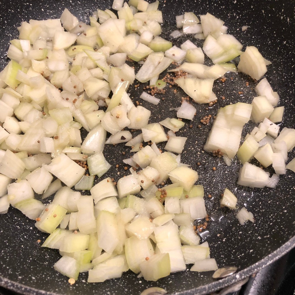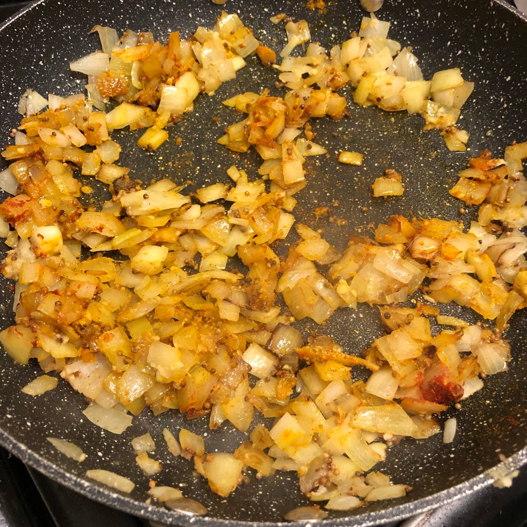 Heat another pan, add the oil. Add the mustard seeds and as they start to pop add the onions and fry for 5 minutes. Add 2 tbsp of the pre-made toasted spice mix.