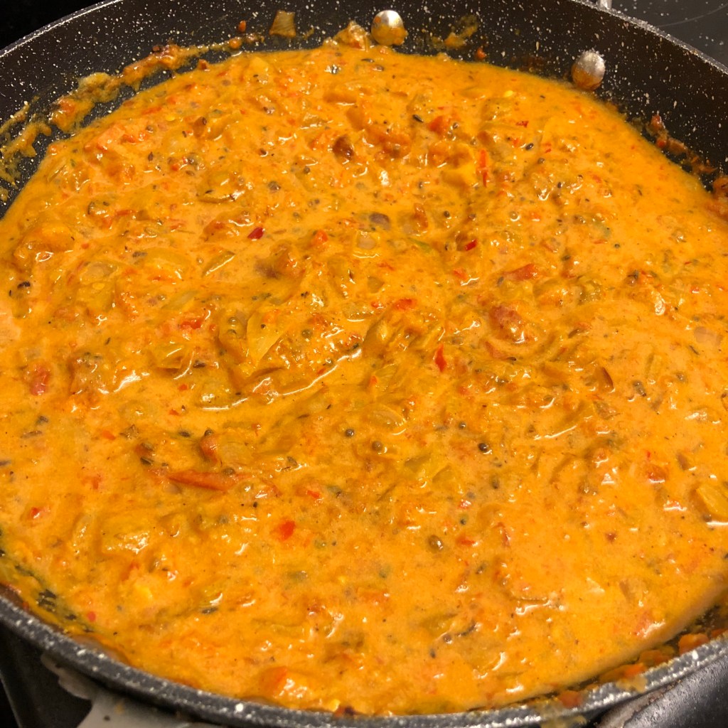 Add the purée mix of pepper and tomato. Cook until this becomes nice and thick.