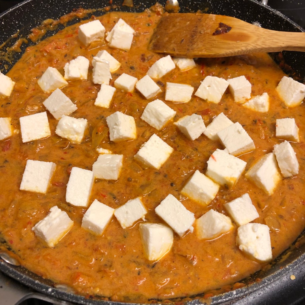Gentle mix these in not to breakdown the paneer so they are coated in the sauce.