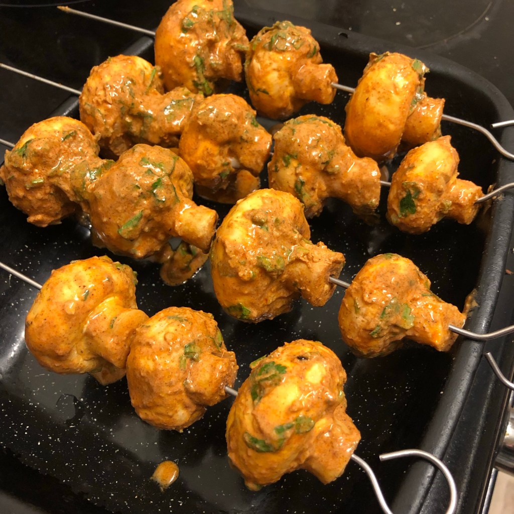 Once the mushrooms have had a flavour party place on the skewers and either roast or on the bbq.