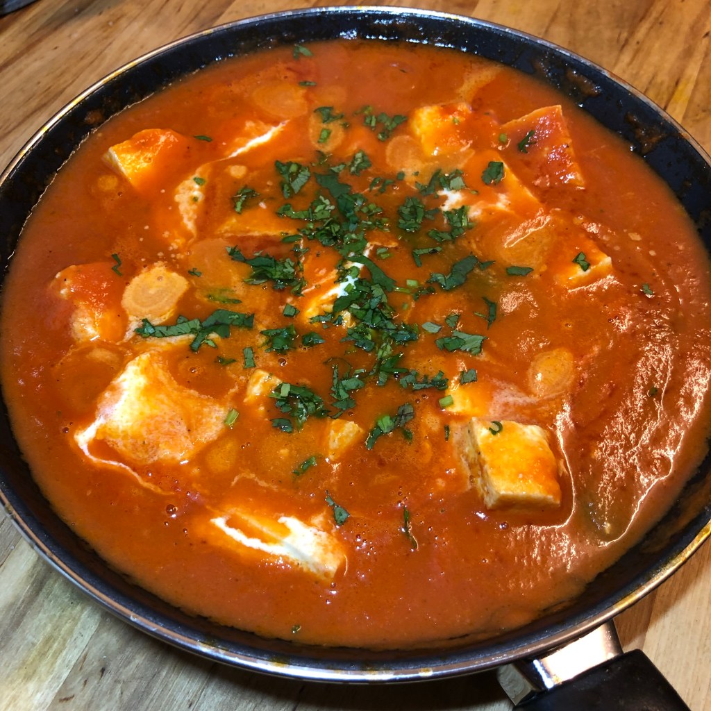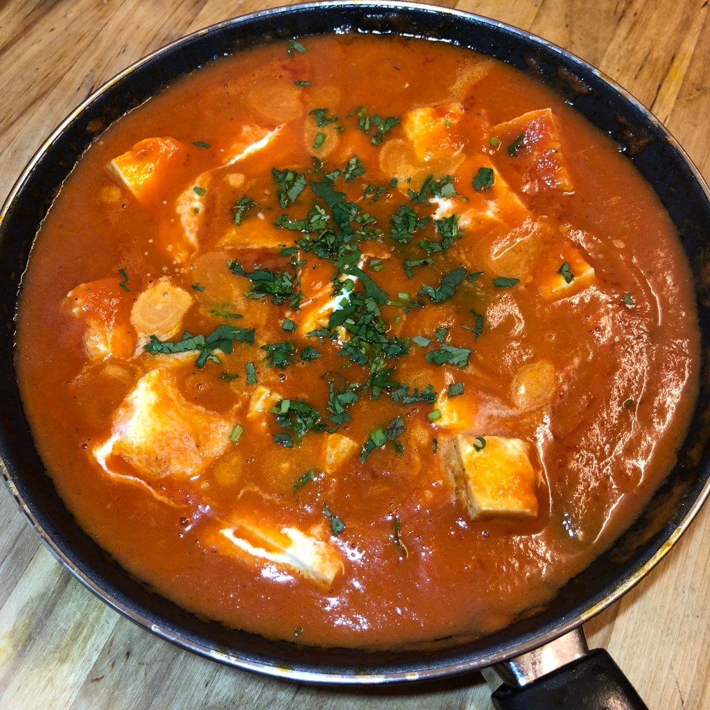 Ingredients – 1 tin of chopped tomatoes, 3 cardamom pods, 2 cloves, 1 tsp of chilli powder, 1 Indian or normal bay leaf, 1 1/2 tbsp of garlic & ginger paste, 1 green chilli, 1 standard packet of paneer – cubed, 50-80g of butter, salt, touch of single cream, fresh coriander.