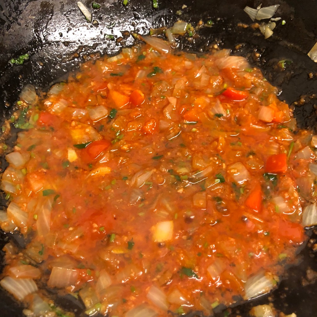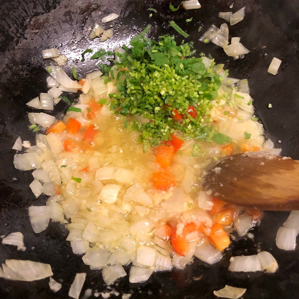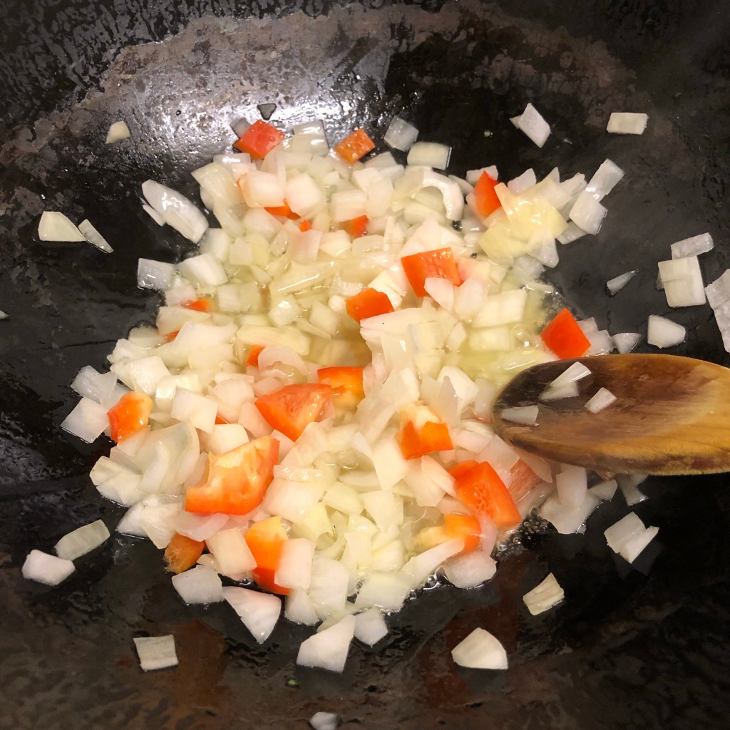 Method – heat your oil, when visibly hot add the onion and red pepper, cook gently for 5 minutes or so colouring the onion.