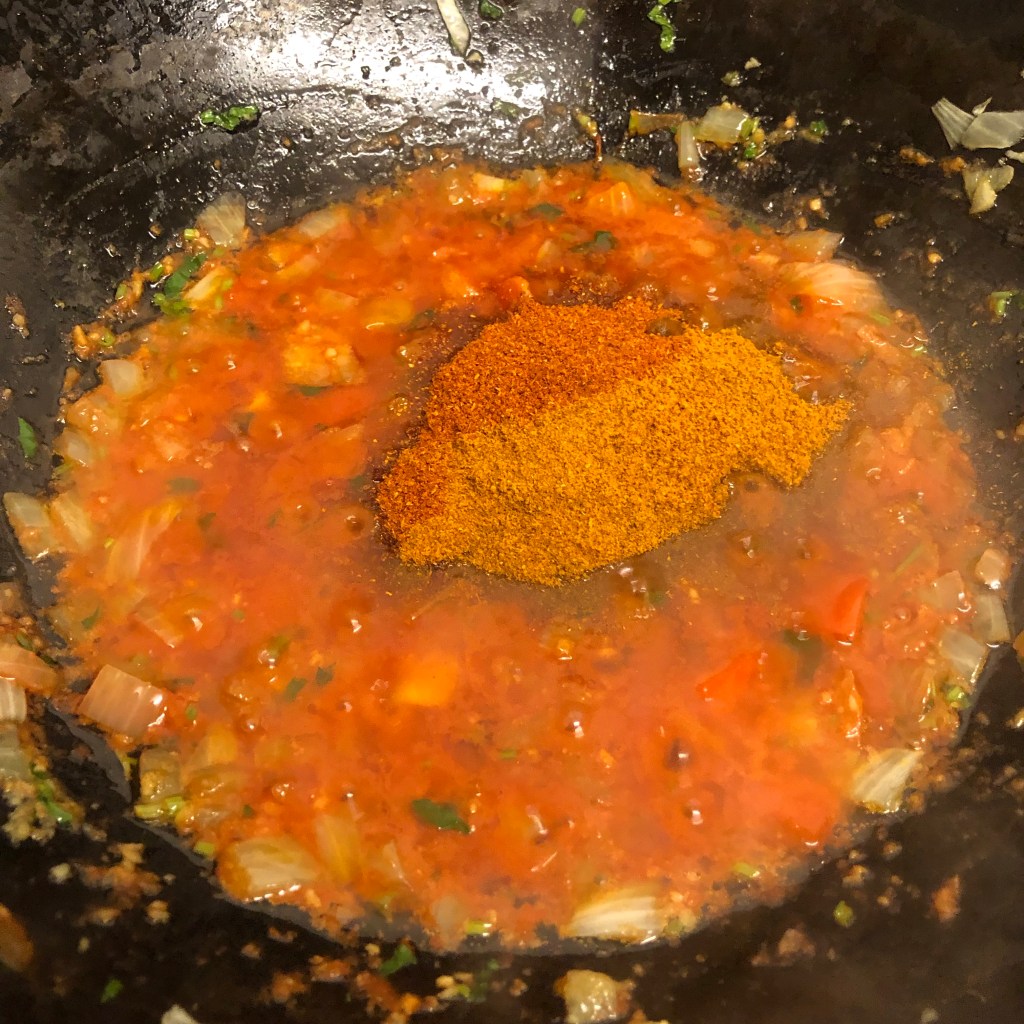 In goes the tomato purée mix followed by the powdered spices again stirring well to combine all these amazing flavours.
