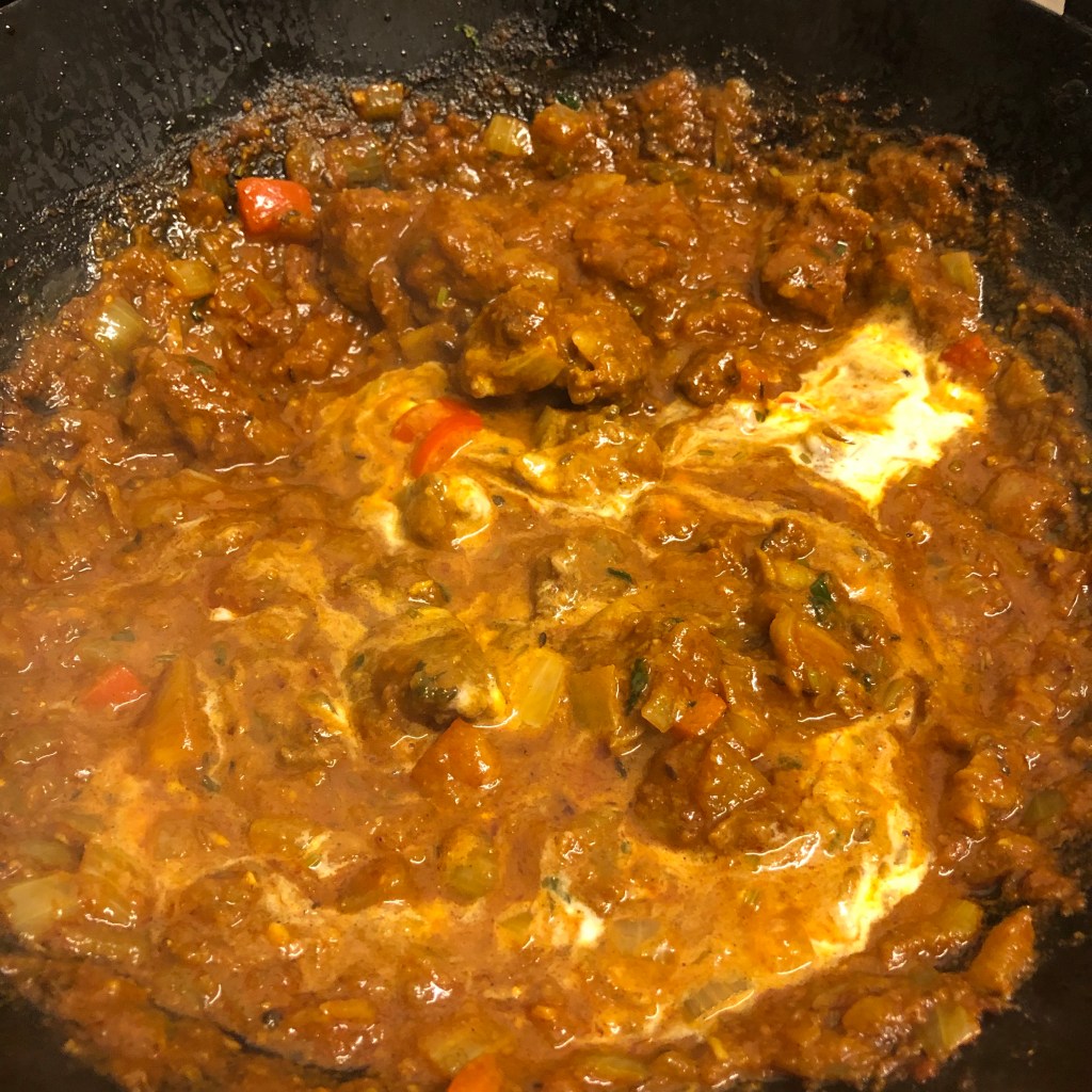 Ingredients- rapeseed oil, 1 diced onion, 1/4 of a red pepper diced, 3 tbsp of finely diced coriander stalks, 1/2 cup of tomato purée mix ( 2 tbsp of tomato purée and 6 tbsp of water) 2 tbsp of garlic & ginger paste, 2 tbsp of mixed curry powder, 2 tbsp of tandoori masala powder, as much of the pre made lamb spiced stew as you require, 2 tbsp of natural yogurt, diced coriander, juice of a lime and salt and pepper.