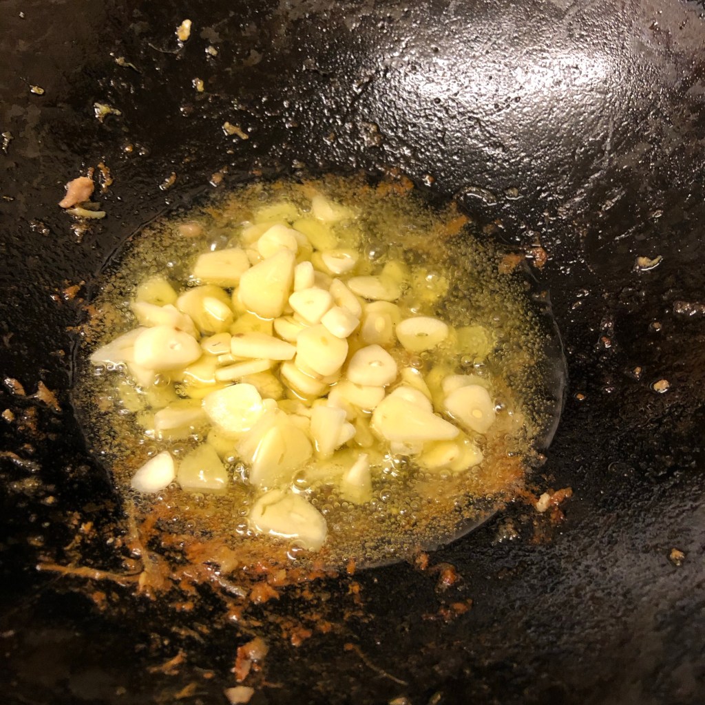 Place the sliced garlic into the preheated oil, allow this to colour slightly for a couple of minutes but DO NOT let it burn as this dish will be spoilt at this stage.