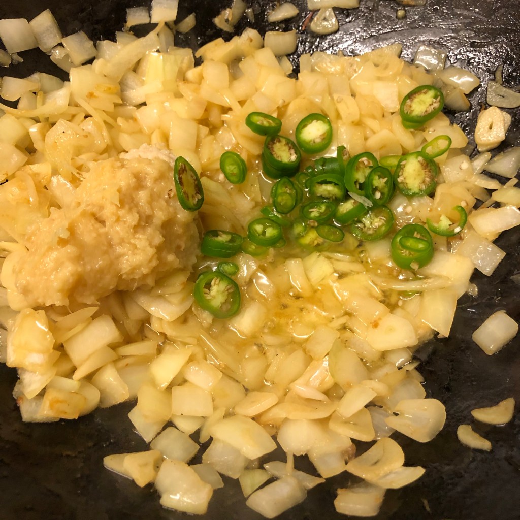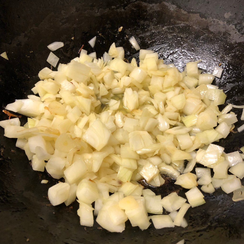 Just as the garlic is starting to colour add the diced onion and fry for another 3/4 minutes adding salt to release the moisture from the onions.
