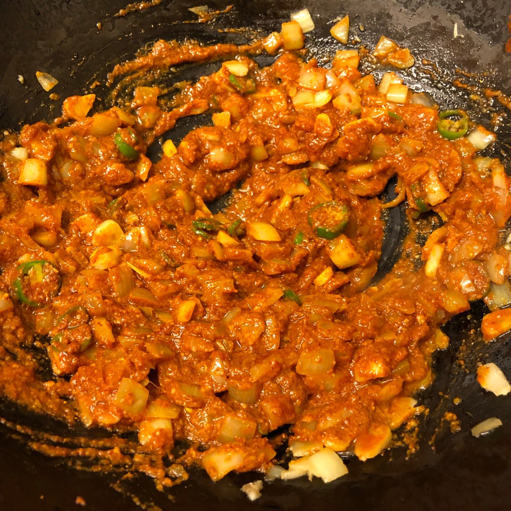Method – heat the oil in a pan, at this point I precooked my chicken then set aside & used the same oil for the main cooking.