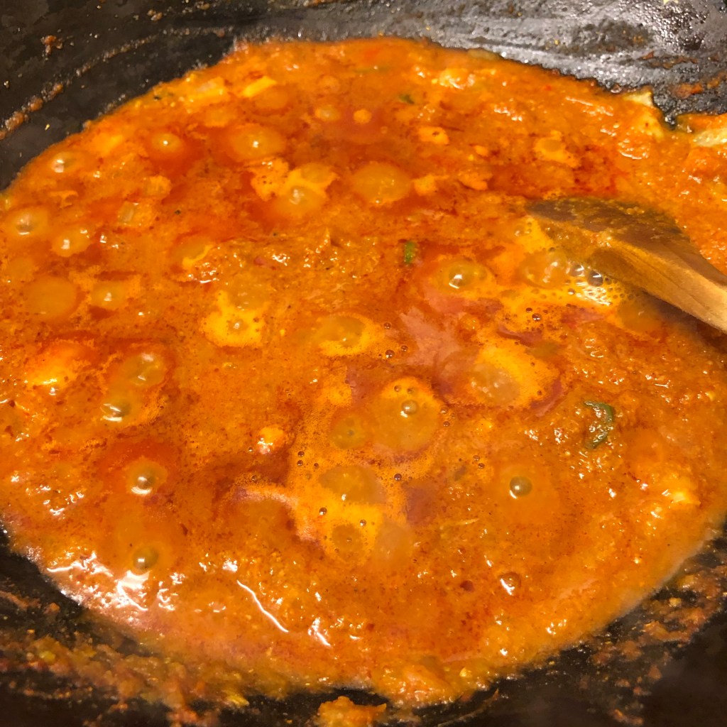 Turn up the heat adding the powdered spices & tomato purée mix allowing it to sizzle for 30 seconds or so.