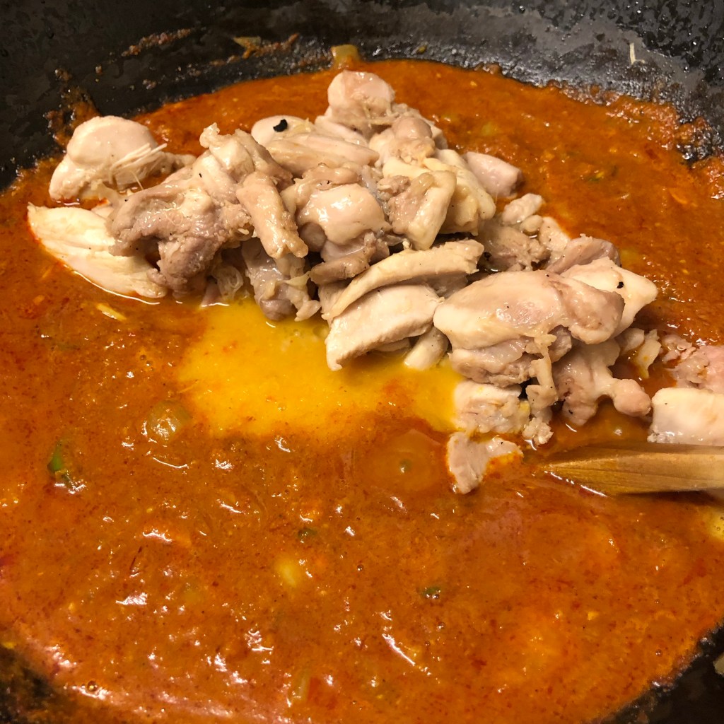 After a couple of minutes scrape the sides back into the pan, add your precooked chicken plus the rest of the base sauce. Again, let this do its thing allowing the flavours to have have a party in the pan simmering away for 2 minutes.
