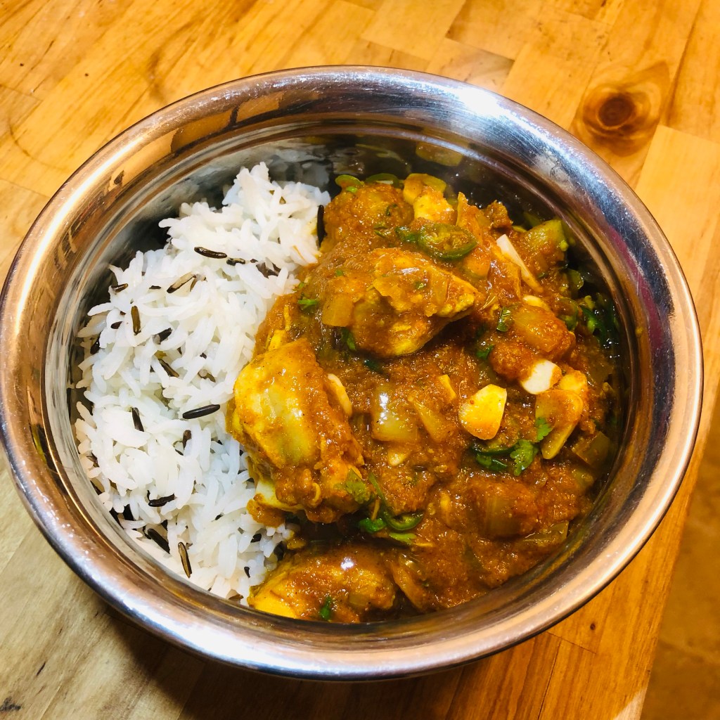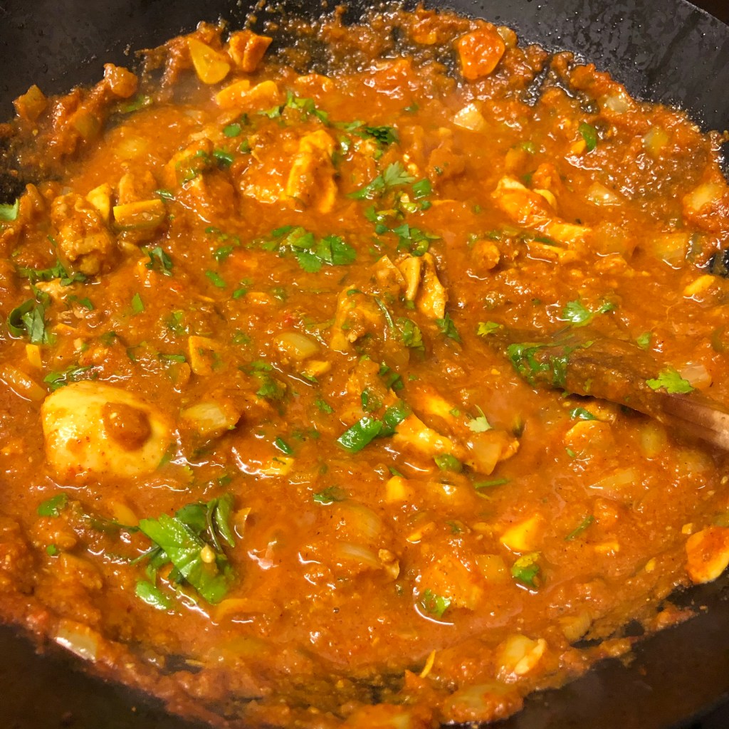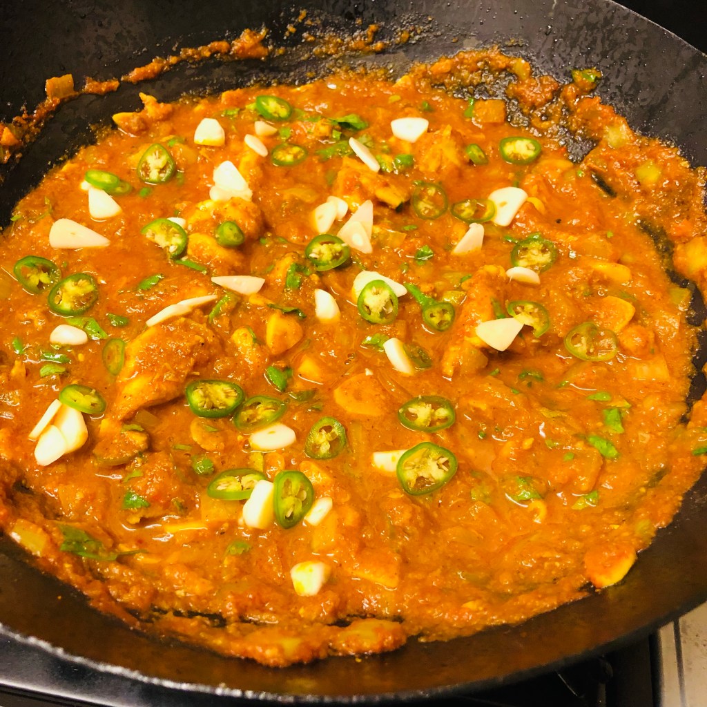 Ingredients- rapeseed oil, 15 (or more) cloves of garlic sliced, 1 onion diced, 1/2 tsp salt, 2 tbsp of garlic & ginger paste, 2 green chillies diced plus another 1 at the end, 2 tbsp of mixed curry powder, 2 tbsp of tandoori masala, 1/2 of tomato purée mix ( 2 tbsp of tomato purée mixed with 6 tbsp of water) 2 cups of pre-made base sauce, chicken thighs ( whatever quantity you want) salt to season, chopped coriander plus extra garlic at the end to decorate.
