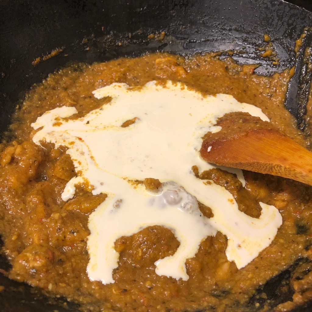 Pour in the cream and mix well. Finish the dish the lemon juice & garam masala.