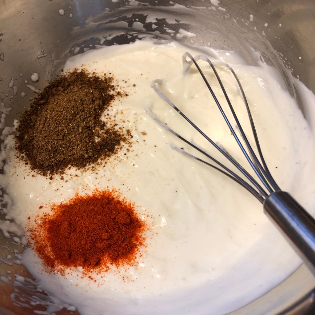 Dry roast the spices over a gentle heat. Once the spices make your kitchen smell great, transfer them to a mortar & pestle, allow them to cool before grinding them to a powder mix. Whisk up the yogurt then add the powder and combine together.
