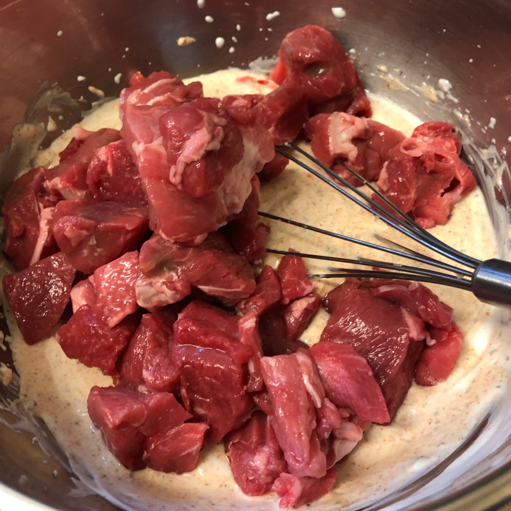 Add the meat to the mixture. For this recipe I let mine marinate for 24 hours allowing the lamb to take all the flavours in