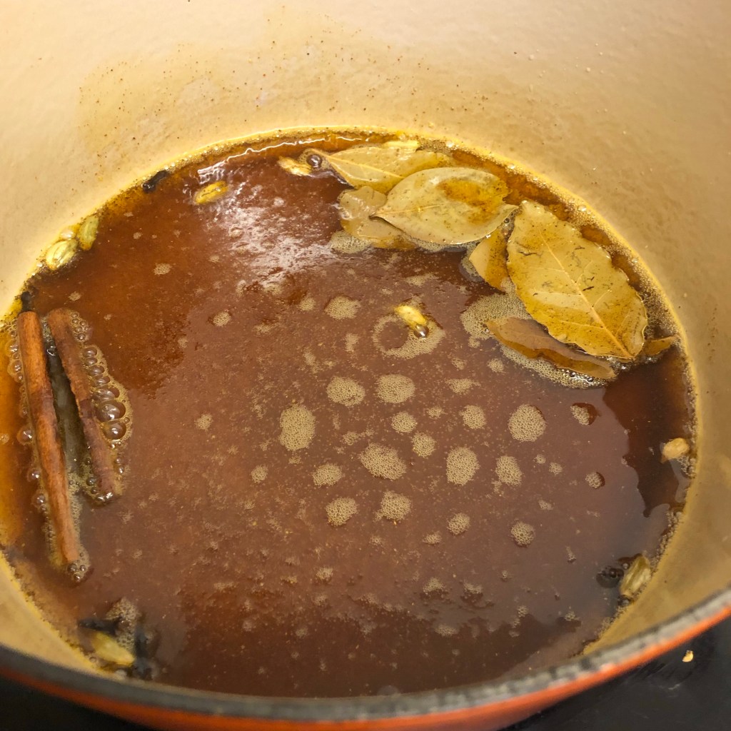 Heat the rapeseed oil and heavy based pan which has a lid. When the oil is hot add the cinnamon, bay leaves, cardamom pods, cloves & asafoetida and allow them to flavour the oil for 45 / 60 seconds.