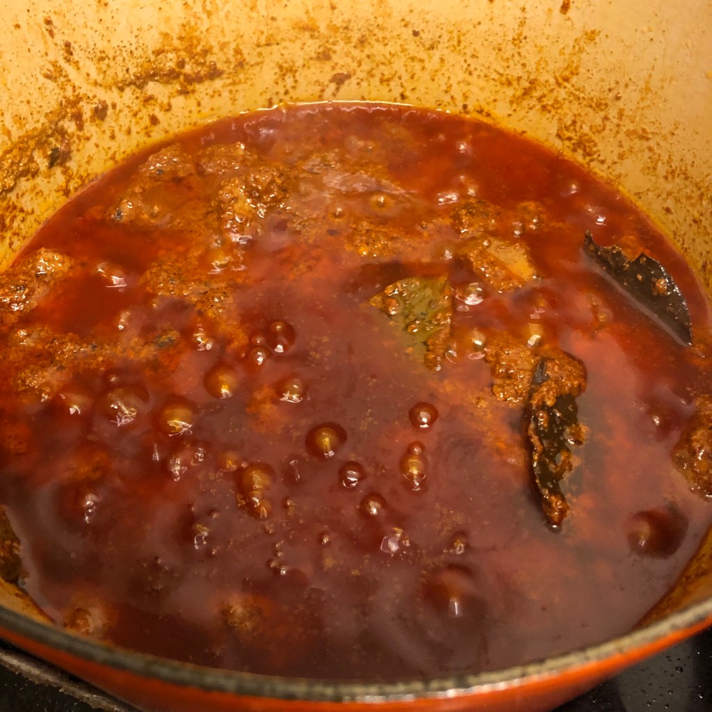 Add the tomato puree allowing this to cook for another 15 minutes or so. The oil should separate and rise to the top giving the dish an authentic look.