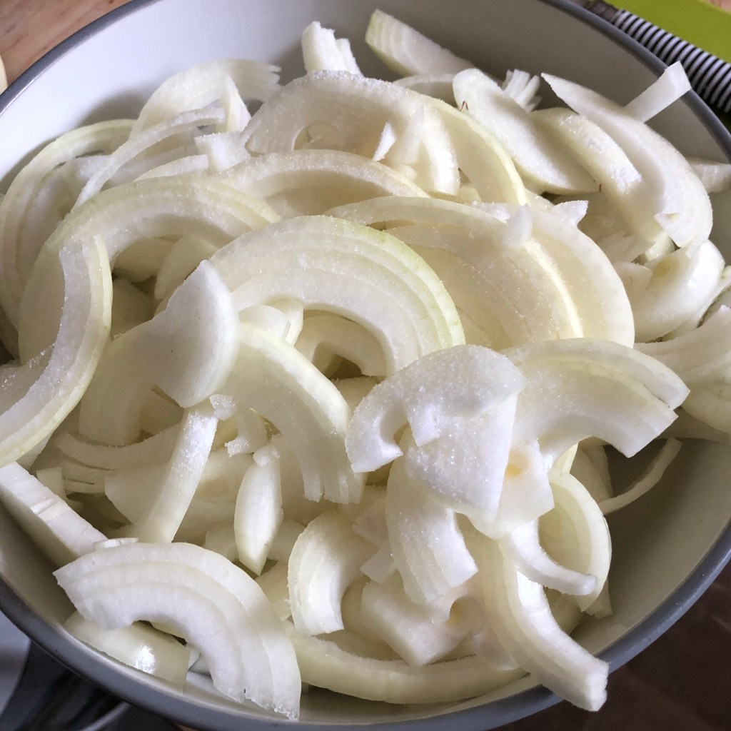 Method – Place the sliced onions in a large bowl. Cover the onions with the salt, mixing with your hands to ensure the onions are coated. Allow the onions to sit for a minimum of 2 hours. This will allow the salt to draw out the moisture.