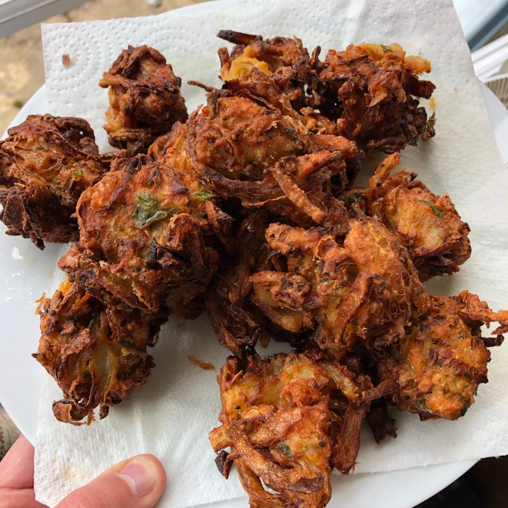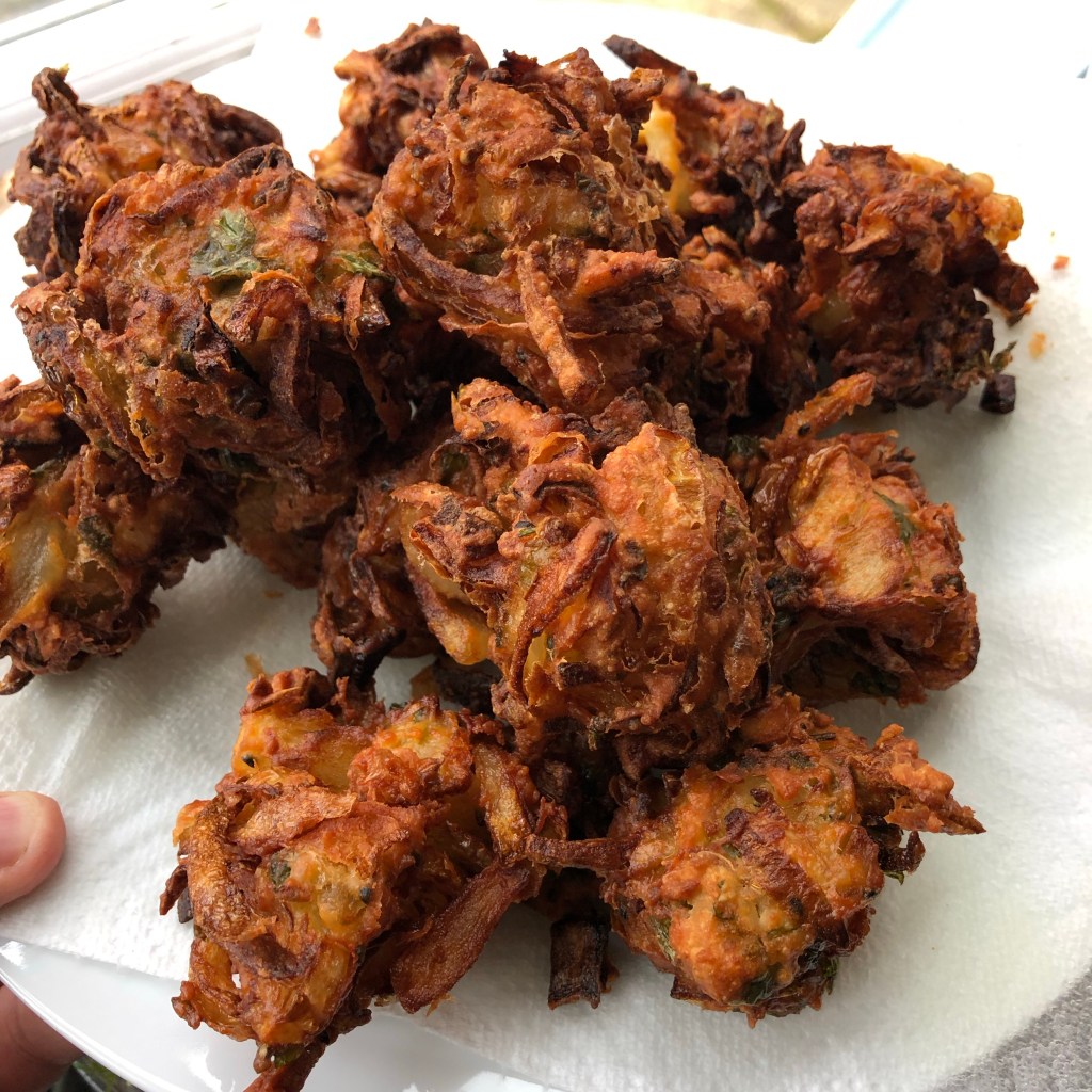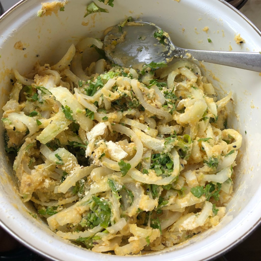 Ingredients – 3 large brown onions – sliced, 1 tsp of fine table salt, 4 tbsp of rice flour, 1 cup of gram flour, 1 tbsp of garlic paste, 1 tbsp of ginger paste, 2 green chilli’s finely diced, 1 tbsp of panch poran ( Indian version of five spice – a mixture of cumin seeds, fenugreek seeds, brown mustard seeds, fennel seeds & nigella seeds all dry roasted together), 2 tbsp of rapeseed oil & 3 tbsp of diced coriander leaves.