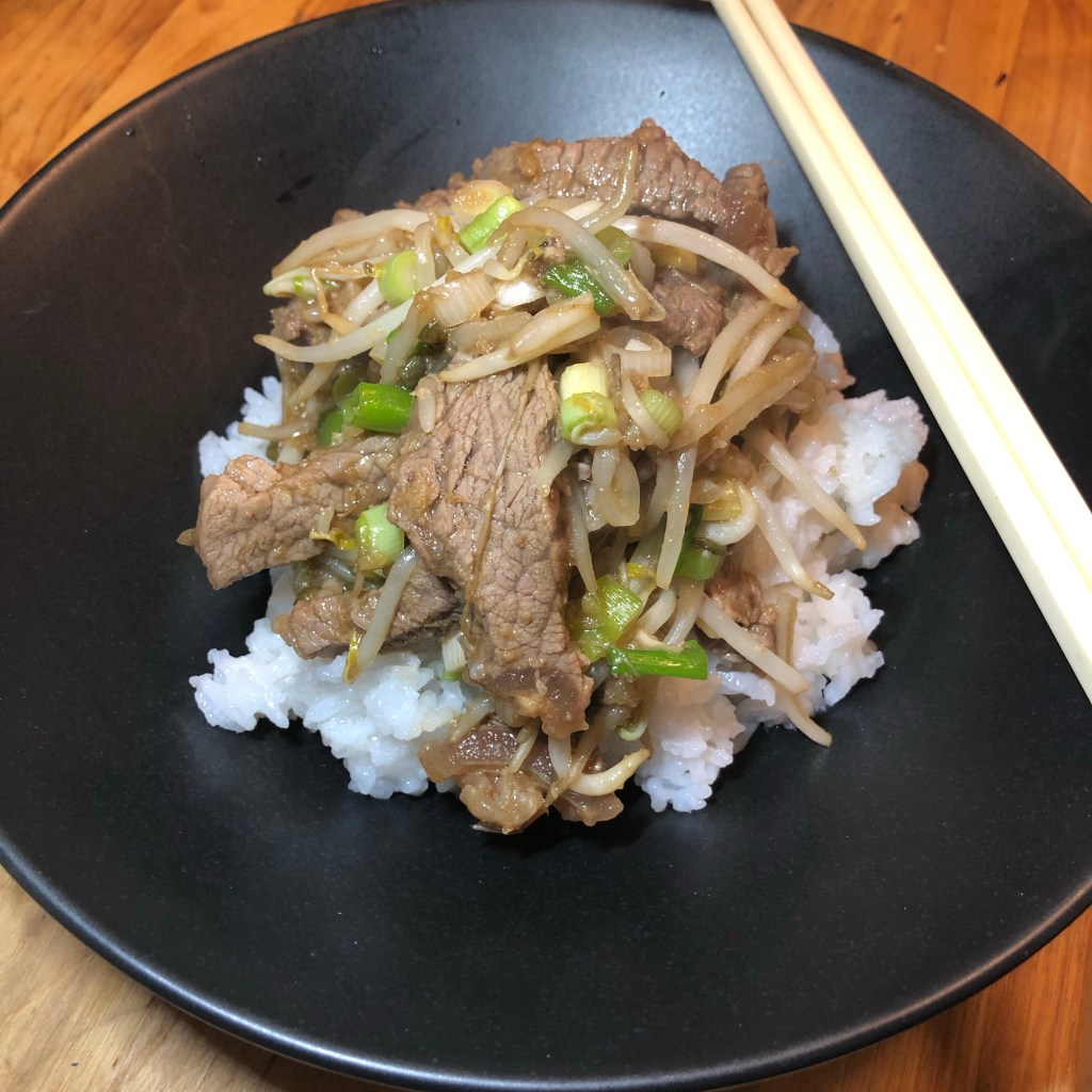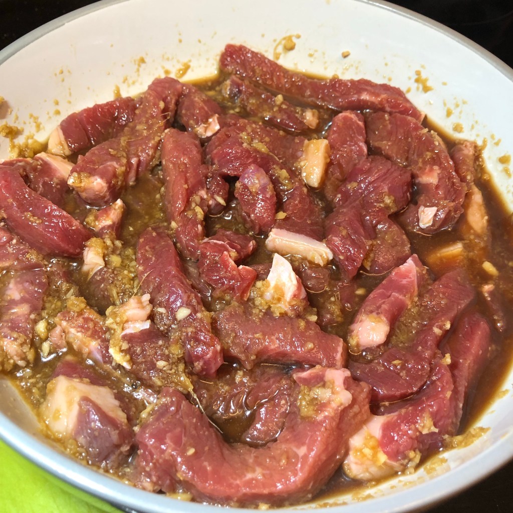 Marinade – 1 tsp of garlic paste, 2 tbsp of ginger paste, 2 tbsp of light soy sauce, 1 tsp of dark soy, 1 tsp of brown sugar & 2 tbsp of mirin. Mix all the ingredients together in a bowl then add your steak ( sirloin) that you’ve cut into strips and mix again to coat the meat with all the flavours.
