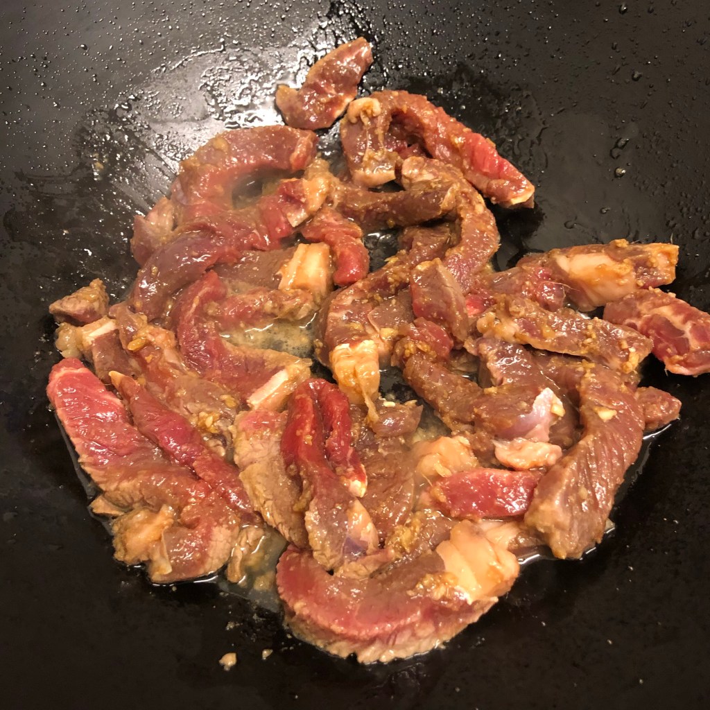 Heat your wok until it’s smoking. Add the ground nut oil. Remove the steak from the marinade but keep the marinade. As the oil is glistening due to the heat add the steak, watch though due to the heat it will spit.