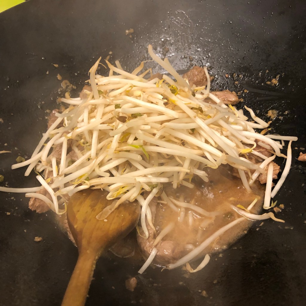 Add the cornflour paste, the marinade and the bean sprouts and and cook for a further 2 minutes.