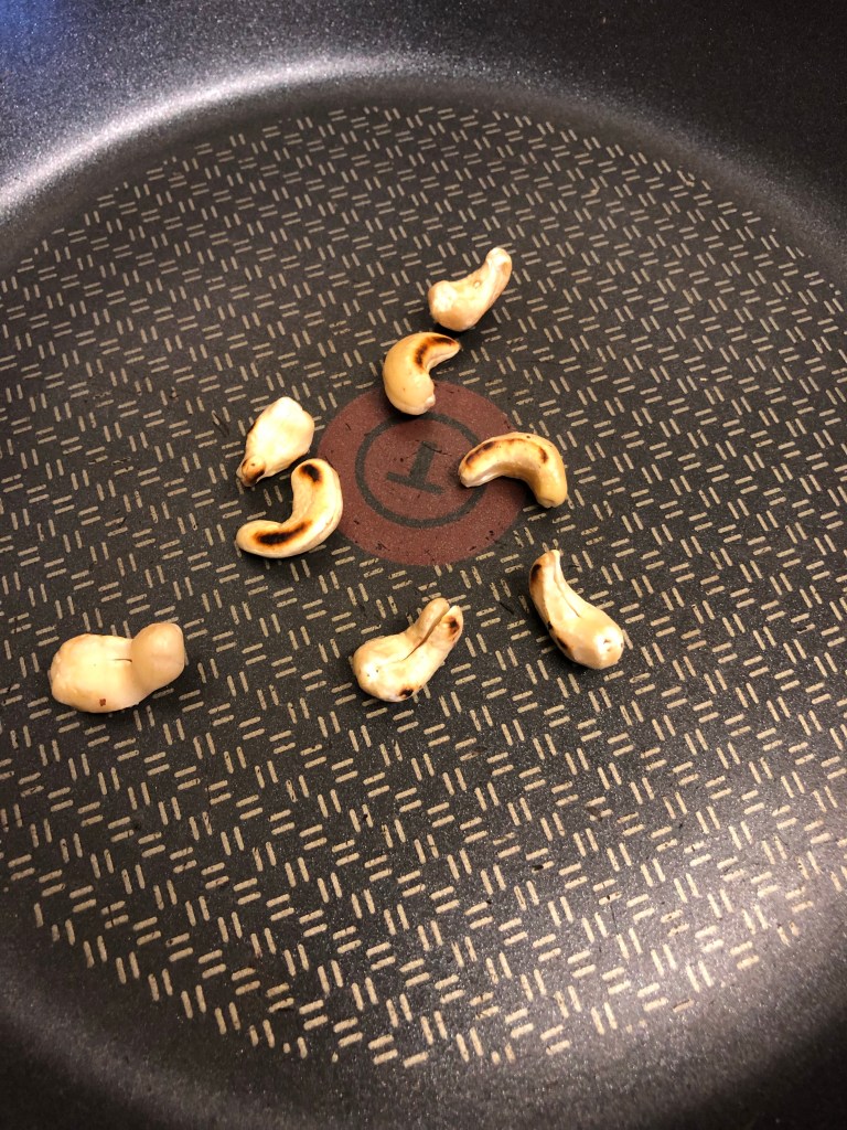 Once the cashew nuts have been patted dry dry roast them to add a bit of colour on the outside. Remove them from the heat and allow to cool which takes just a few seconds.