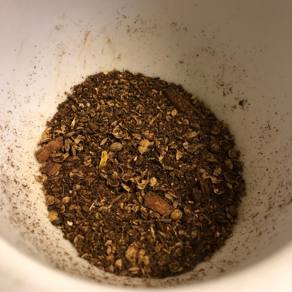 Once the pan roasted mix has cooled slightly add them to a pestle and mortar and grind them all into a powder mix. The cashew nuts and coconut can be then added with 1/4 of a cup of water to make a nice paste. Then set aside.