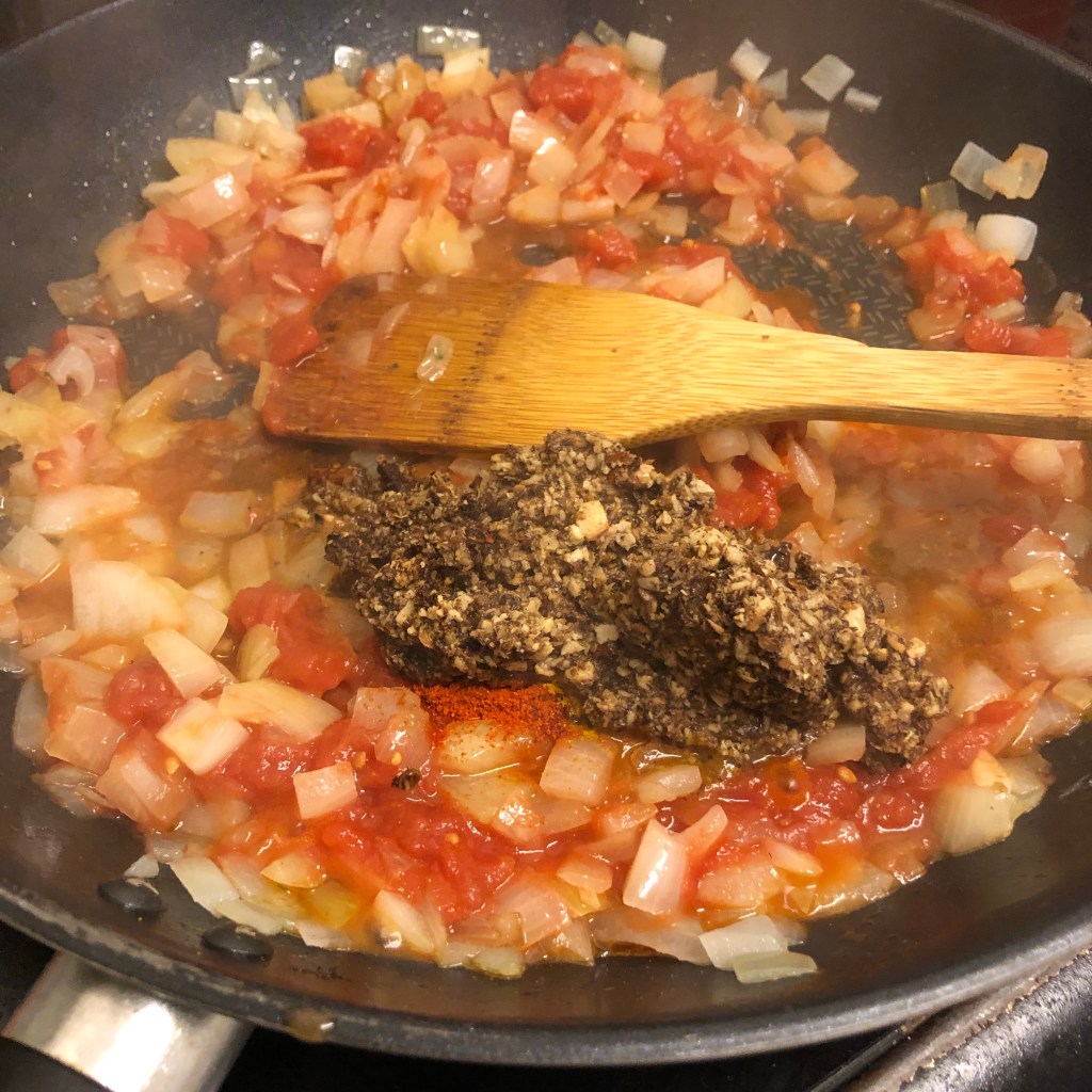 Add the blended tomatoes, turmeric and chilli powder and the spice paste and cook this out for a minute or so.
