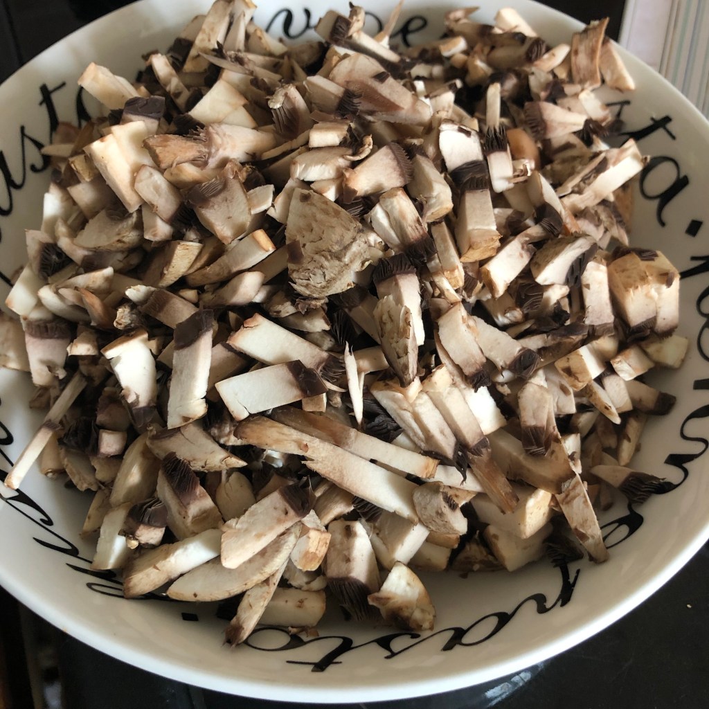 To start, make the mushroom filling. Finely dice the mushrooms.