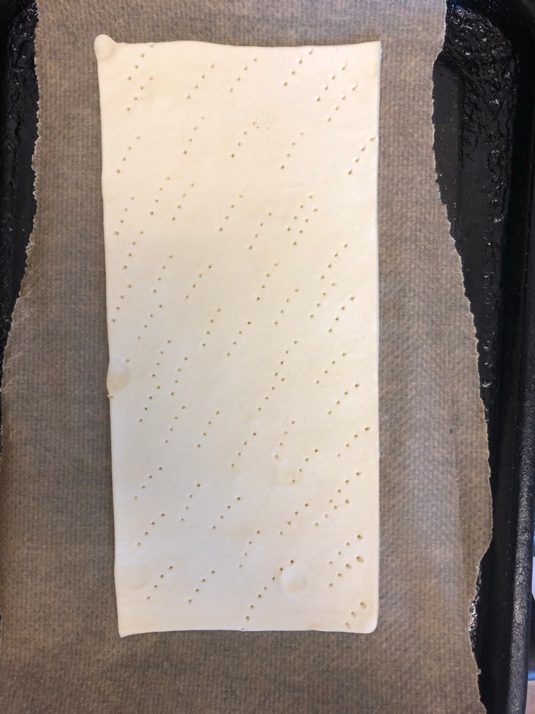 For the pastry. Cut a piece of puff pastry in a rectangle bigger than your salmon fillets. Once the oven has reached its heat around 220c place your rectangle of puff pastry on a sheet of baking paper, prick the pastry with a fork and cook it for about 15 minutes or until nice and brown.