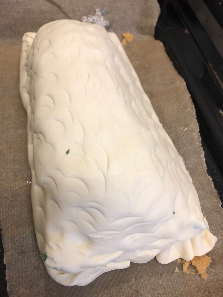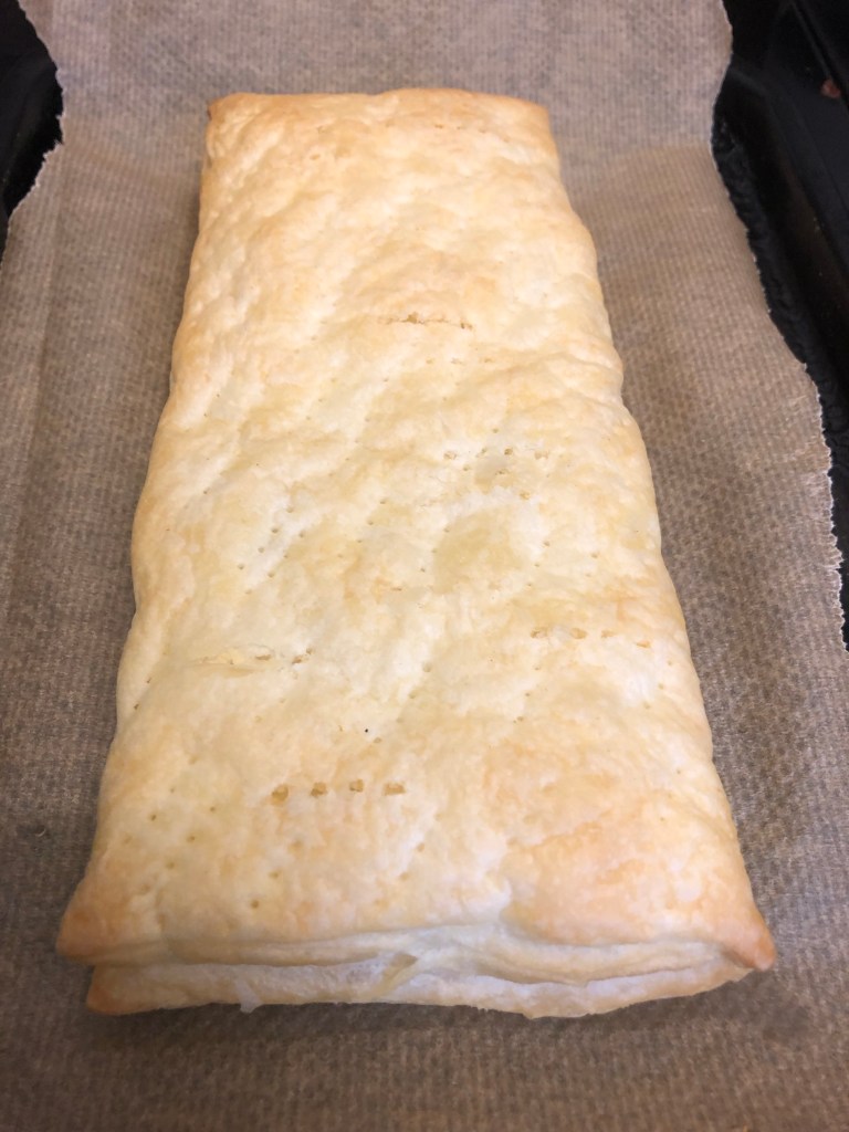 Cut a large piece of the puff pastry, wrap the piece of pastry over the salmon and tuck it under the precooked base. You can used a small spoon to mark the pastry to make it look like scales if you’re feeling fancy!!