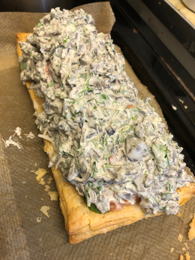 Allow the pastry to cool. Spread a level base of the mushroom mix on the pastry.