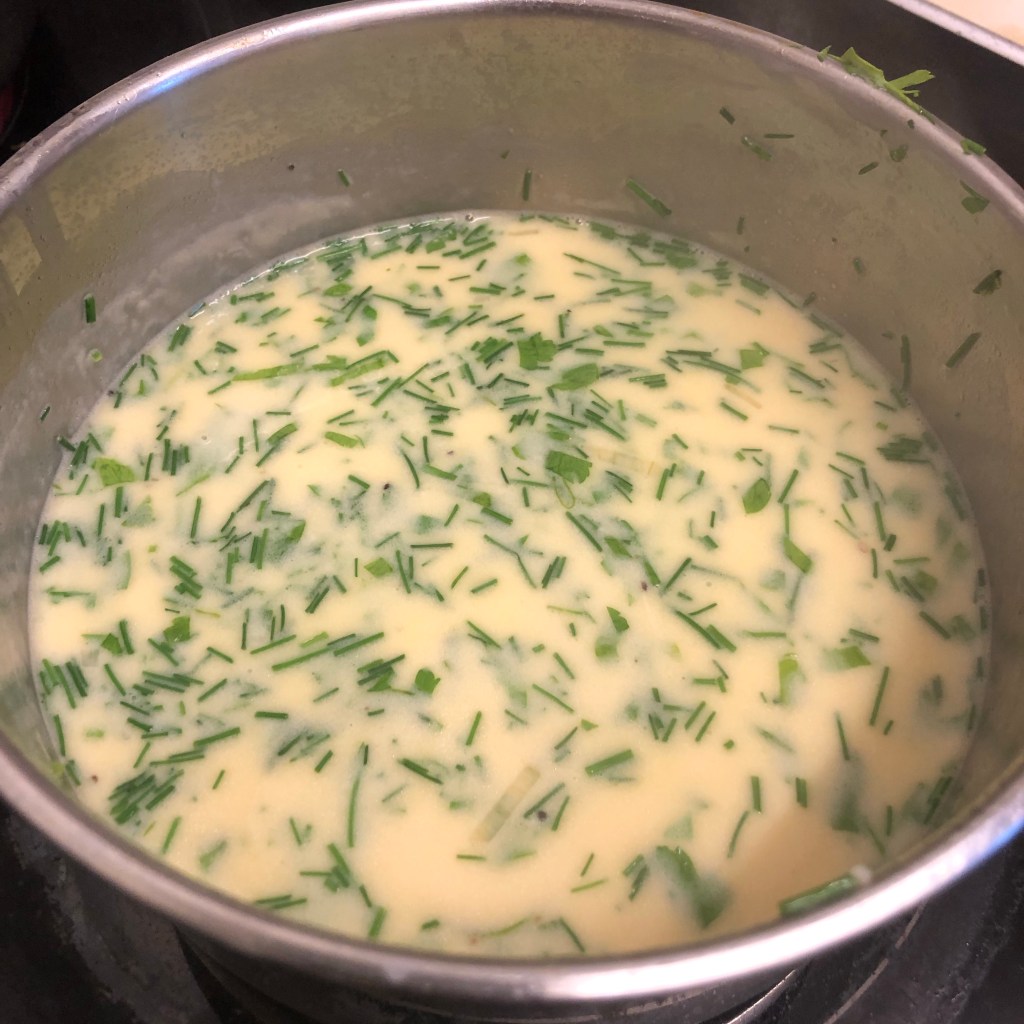 Once simmering add the remaining butter, a small cube at a time whisking as you do. Then add your chopped herbs and stir keeping warm until you need it occasionally stirring.