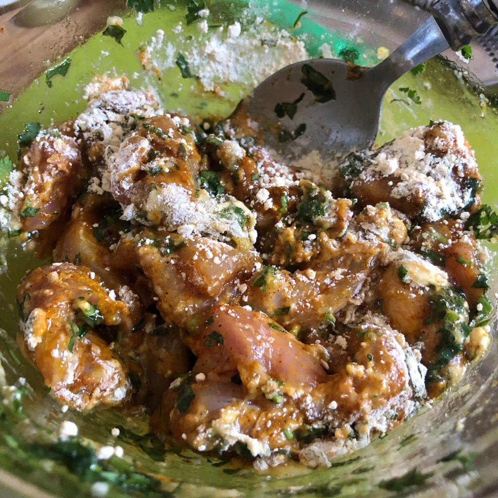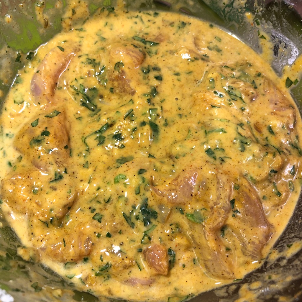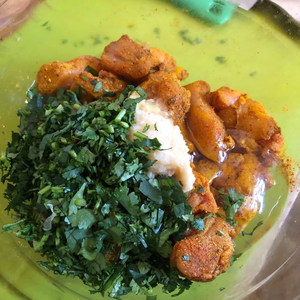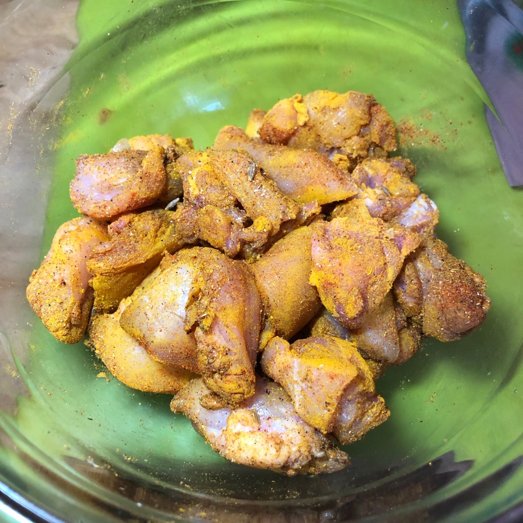 Method- place the chicken in a large bowl & mix with the turmeric, garam masala, chilli powder & a little pinch of salt to cover the meat. Allow this to sit for 20 plus minutes.